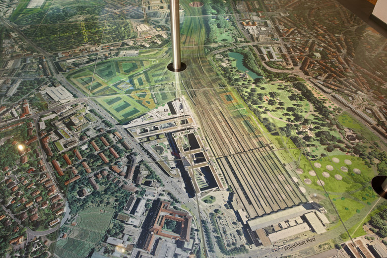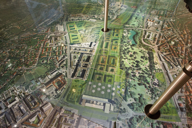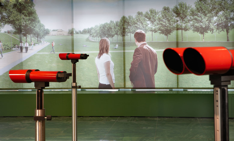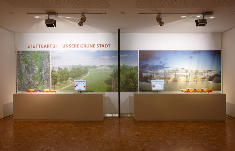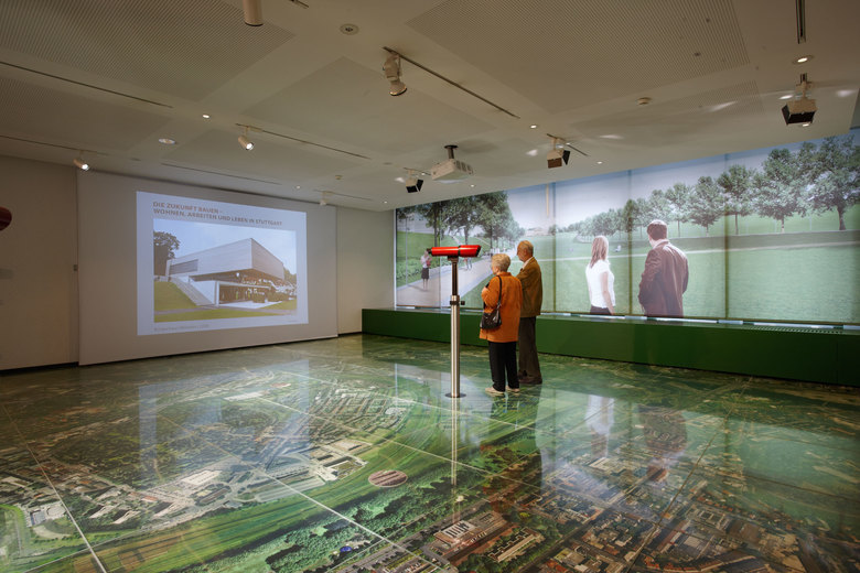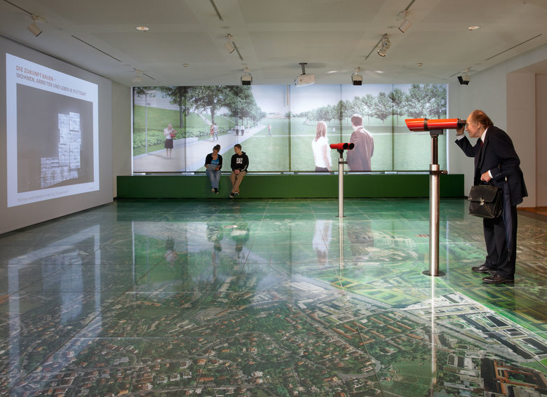 See the future: The permanent exhibition »Stuttgart 21 – Our Green City« dedicated to urban development, arouses curiosity about new quarters in the centre of Stuttgart. An accessible map that changes its appearance with every step is spread over 120 square metres. By means of a lenticular foil the present rail tracks are transformed into green urban spaces. Digital telescopes allow for insights and outlooks on present and future construction projects.