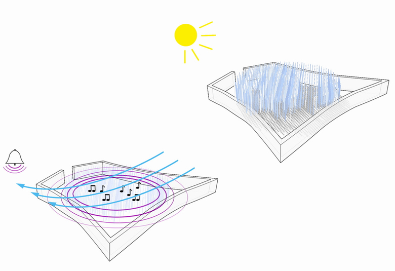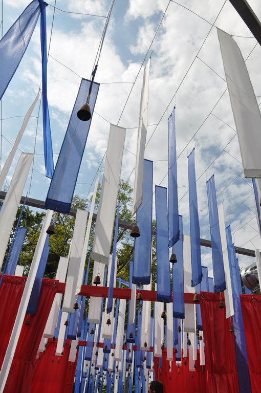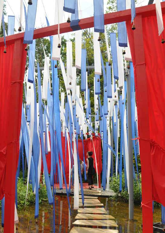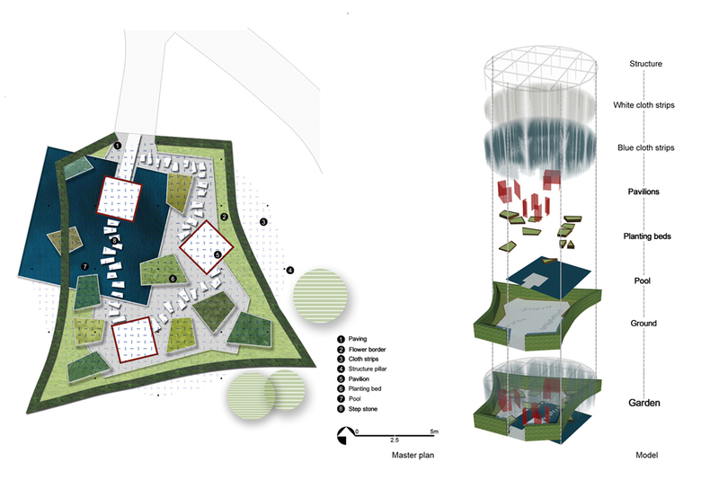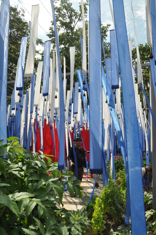 For the exhibition theme of this year, we envision everything between the sky and the ground will be garden in the future. We create the “sky and clouds” by blue and white cloth strips, and the “ground, farmland and field” by sands, crops and vernacular flowers. Three boxes wrapped with red cloth symbolize our houses and provide us resting places. A pond represents lakes on the earth, mirroring the sky and clouds. Between the sky and the ground is the home of all creatures and gardens of human beings. In this small space, people can feel the sunshine, swaying cloths strips, jingle bells and misty poetic.