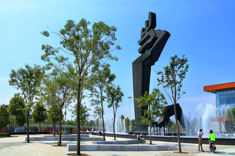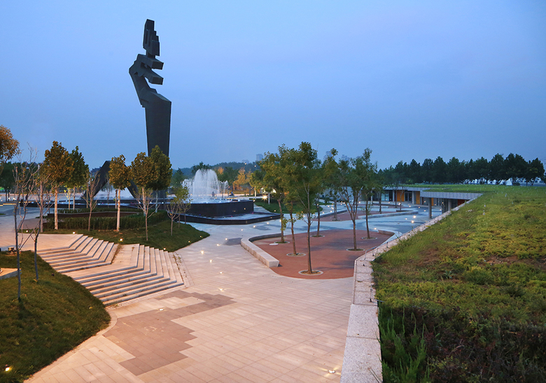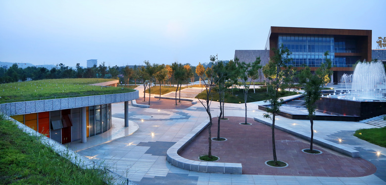 Due to the main exhibition is the Wang Yirong’s oracle bone script collections and researches, meanwhile the sculpture is designed from oracle bone script, the design languages of the plaza, such as green islands, water pools, amphitheaters, steps, benches, lightings, pavement, are all inspired by the structure and stroke of oracle bone script. Qinglongshan Cultural Plaza integrates the hill, museum buildings, dragon sculpture, city roads, river and other surrounding environments to become a vital and cultural urban public space.