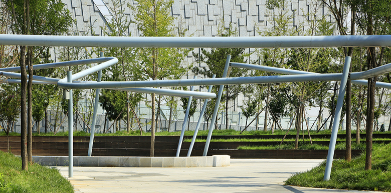 The half-sunken service building with green roof at the southeast corner separates the plaza with busy traffic roads. This building further defines the space of plaza, creating a whole and comfortable environment and visual effect.