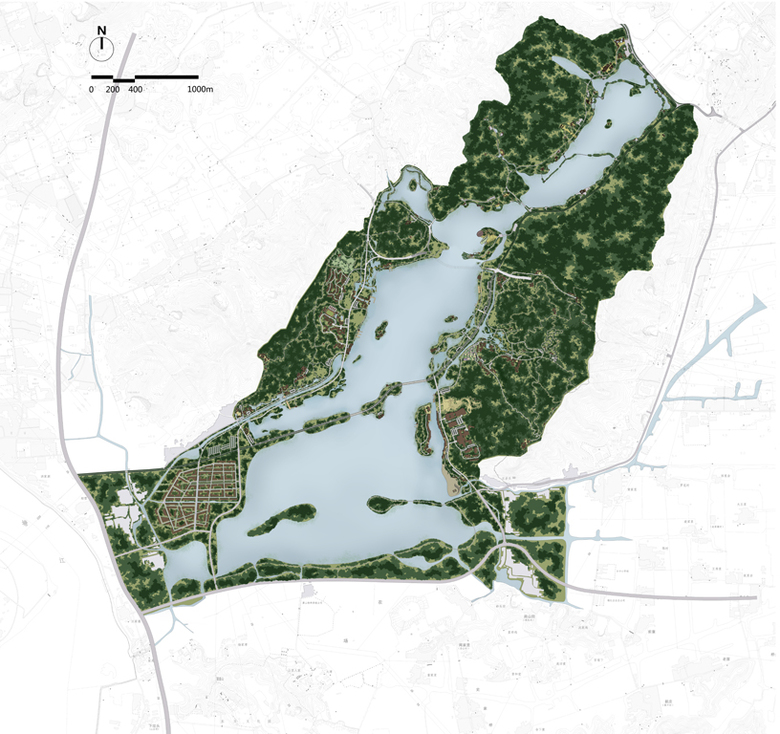 In order to restore to its earlier natural status, we extend Xianghu Lake water area into the valleys and make it closely linked with the surrounding mountains. Some small lakes are dotted at the foot of the mountains. They not only generate the spatial variations, but also collect rainwater running from the mountains to prevent the sediment and leaves flowing into the main lake.