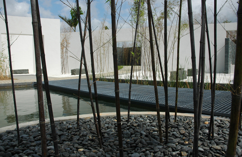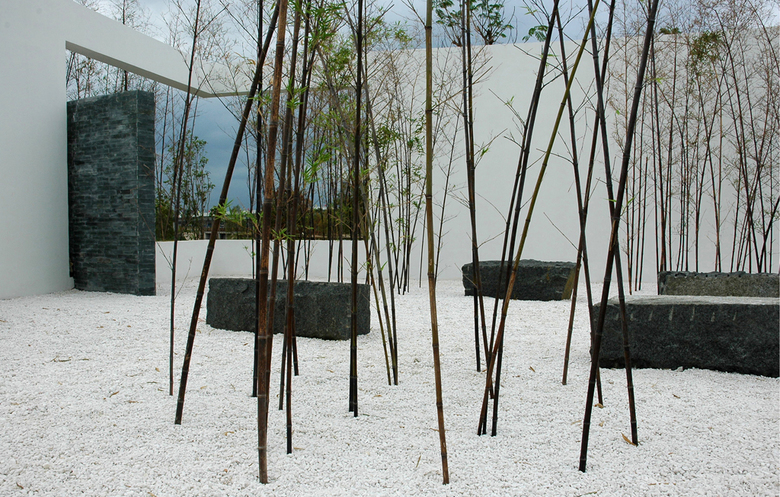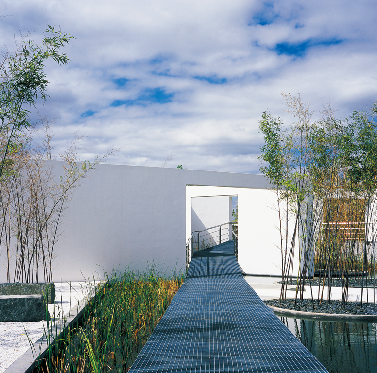 With two walls intercrossing, one white zigzag wall and the other gray curved-straight stone wall, the garden has a unique boundary, both clear and blurred, linking the inside and the outside together. The two walls divided the garden into a frontcourt and a main court, and the latter is composed of many small interconnected spaces of different scales, shapes and forms. This is the typical spatial structure of traditional Chinese garden. The central reflecting pool, green bamboo, white and gray walls, bring Bamboo Garden a strong Chinese style and sense of Chinese brush drawing. The unpredictable spatial changes make the garden with deep poetic.