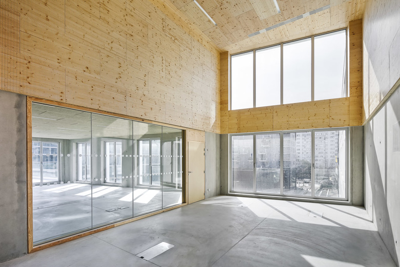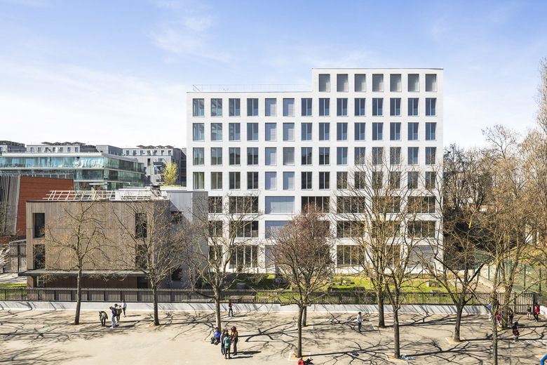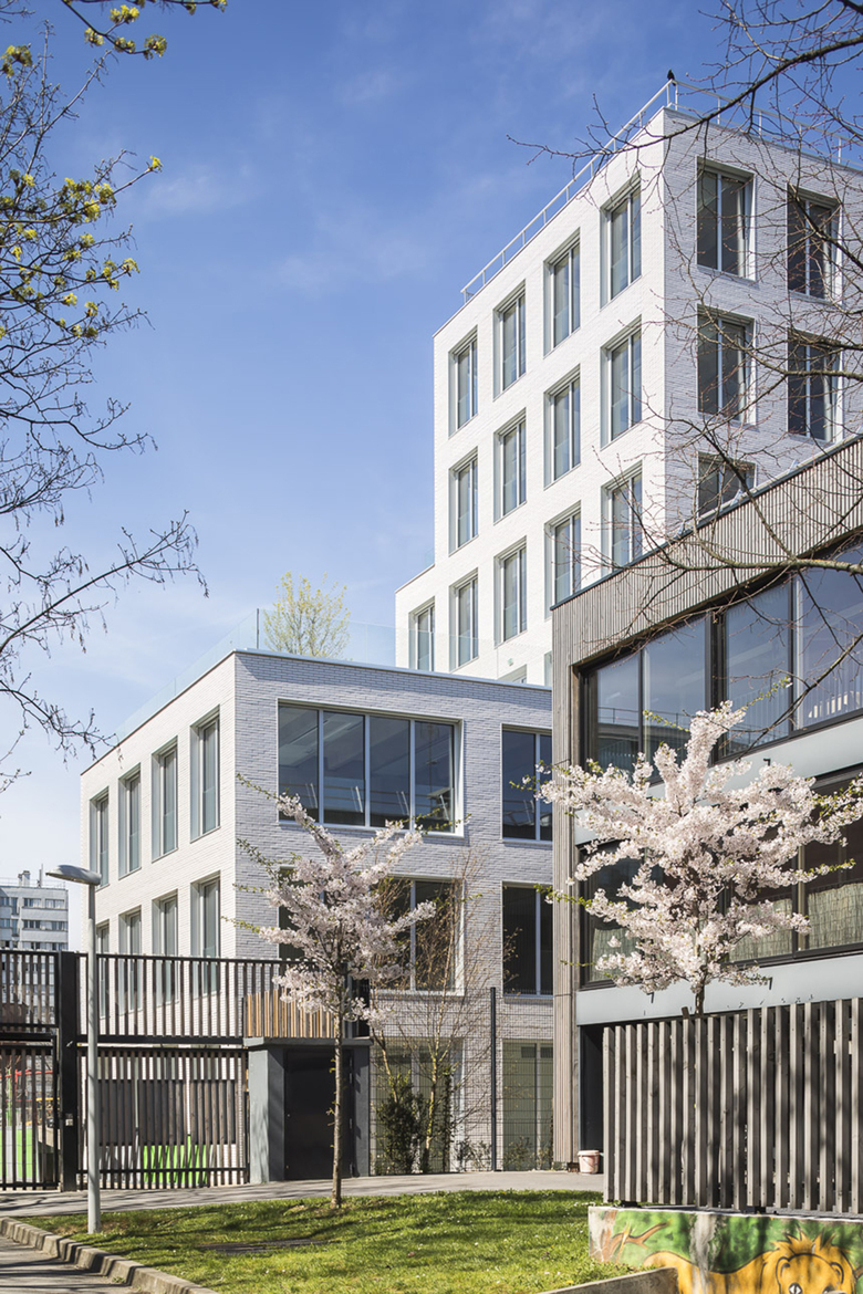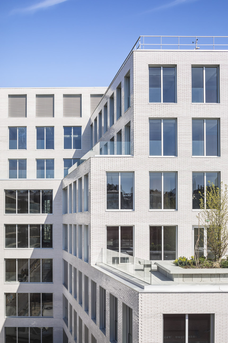 It is a terraced structure that splits and turns at a right angle, remaining parallel to a second road. The L-shaped building has large bay windows looking out from all sides throughout, while a large hall traverses and opens up the ground floor. The entrance halls meet in front of the elevators, preserving an east-west transparency at all levels of the building.