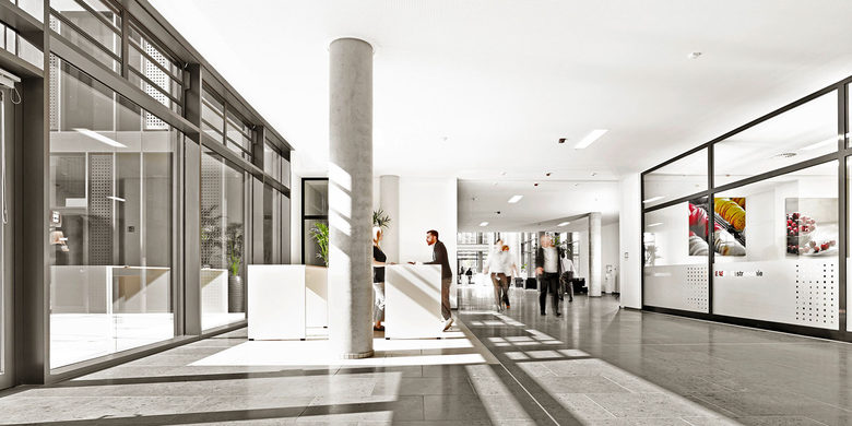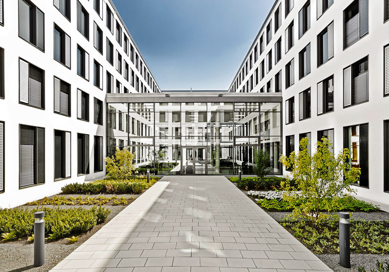 Special attention was paid to the design of the façade, the ecological components and the open spaces. In line with the modern and representative architectural language of the ensemble, the façade is organized with classical simplicity. The dialog between the vertical metal window elements and the horizontal slabs lends the building an urban character. These façades enable the building to be naturally ventilated. The individual green internal courtyards and other external areas are laid out as an orthogonal grid consisting of alternating strips of greenery and gravel. The terraces act as functional external spaces which provide an attractive extension to the working environment.