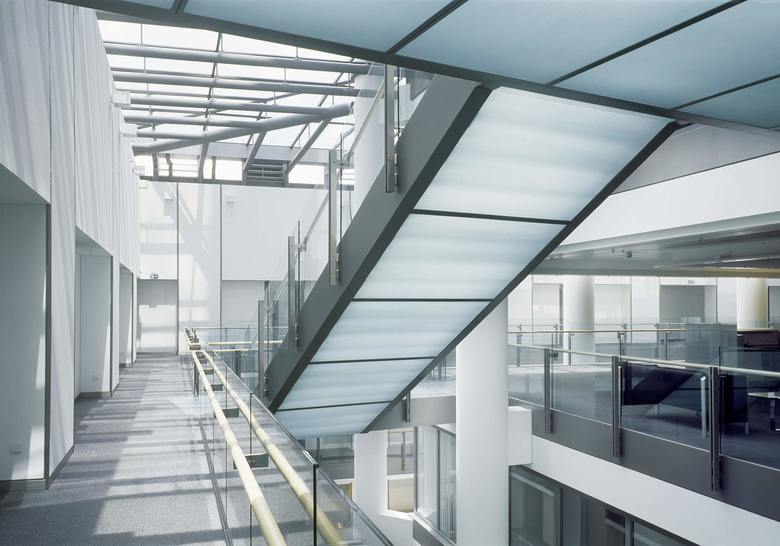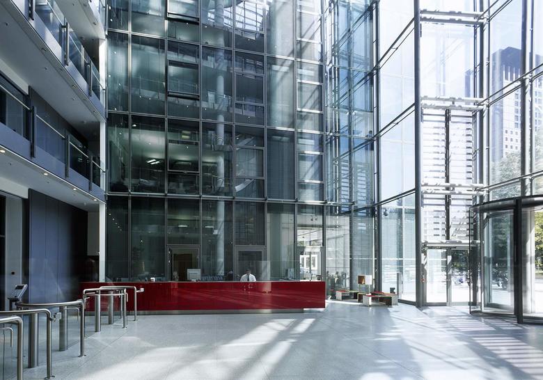 The standard floor plan shows the clear distinction between the two transparent office towers with their differing heights and the massive core. With the employee casino, restaurants and exhibition space in the low building, which is clad in natural stone, and the English Theatre in the basement the project makes a significant contribution to the integration of public activities and office activities within the tower.