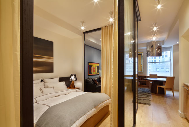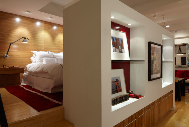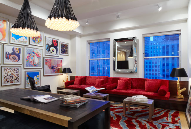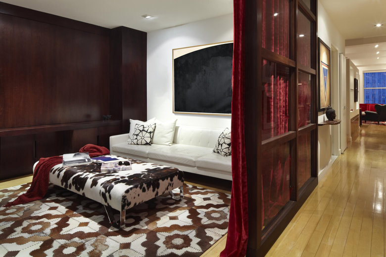 Good design must reflect the personality of the client. So when siblings purchased studios in Downtown by Philippe Starck, one of the first buildings to herald the revitalization of Manhattan’s Financial District, the aim was to create environments that were truly bespoke. The brother’s tastes jibed synchronously with the insouciant idea of France’s most popular prankster converting a building that once housed the buttoned-up offices of JP Morgan Chase. His collection of Takashi Murakami works, the gallery-like centerpiece of the main area, announces his boldness and flair up front, as do furnishings by Droog, Moooi and, of course Starck, as well as hide rugs and upholstery, and a predominantly red palette. His sister was after something soothing and discreet. So Axis Mundi responded with a neutrals and used glass to carve out a bedroom surrounded by drapes that transform it into a golden cocoon. Hide (albeit less flamboyantly applied) evokes a familial commonality, and built-in furniture and cabinetry optimize space restrictions inherent in studio apartments.