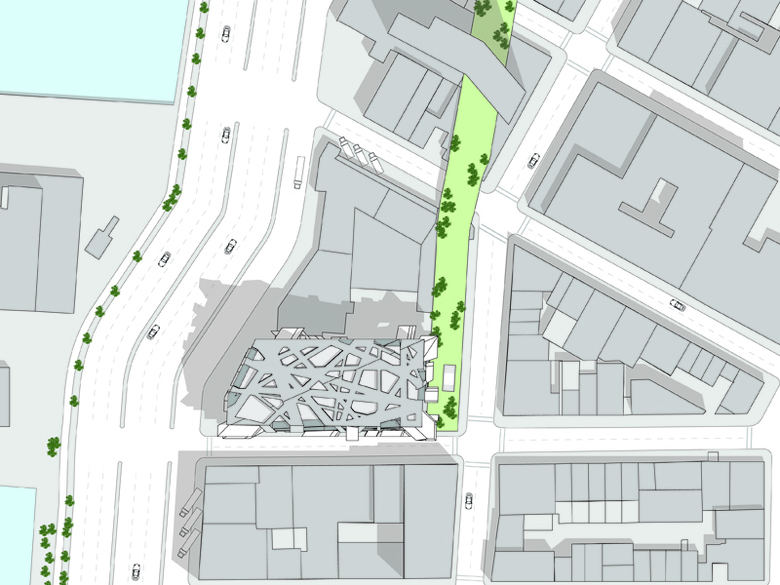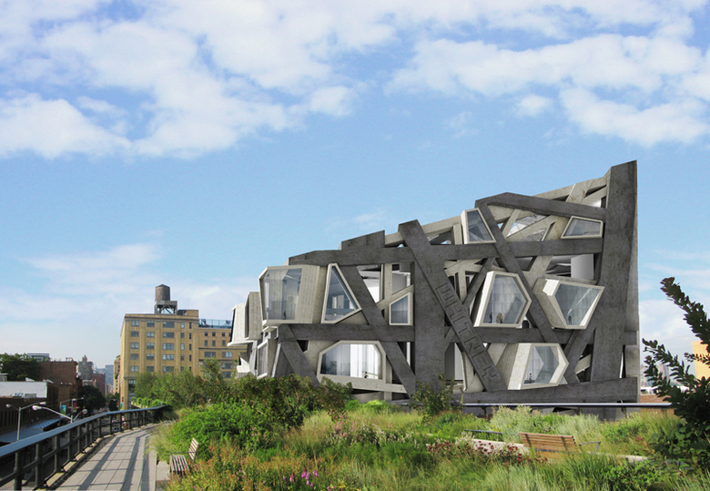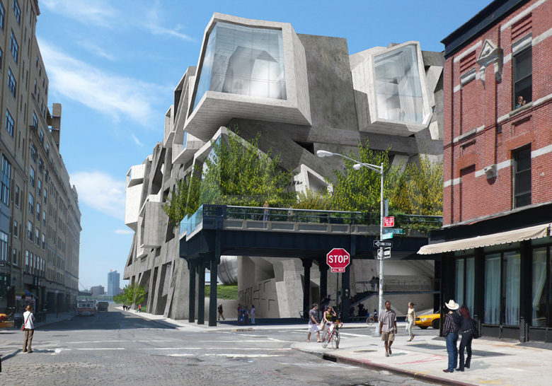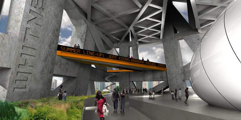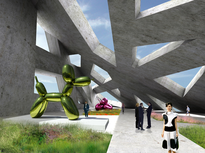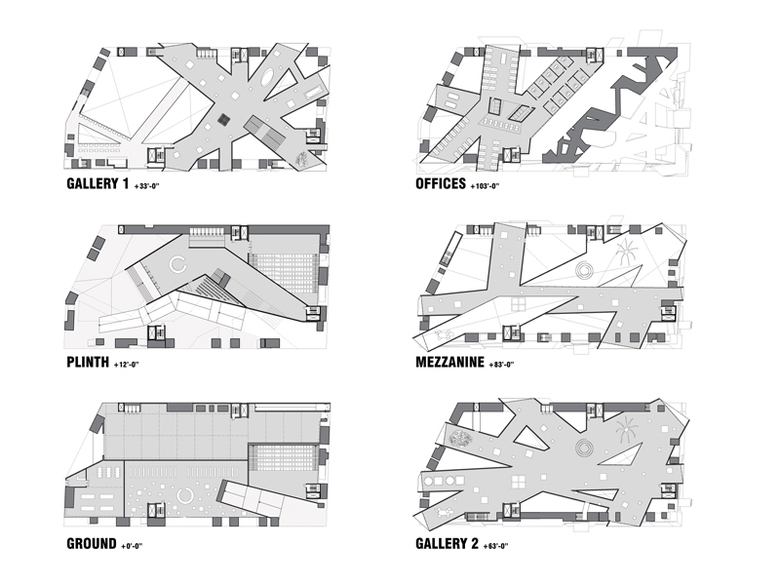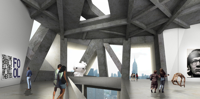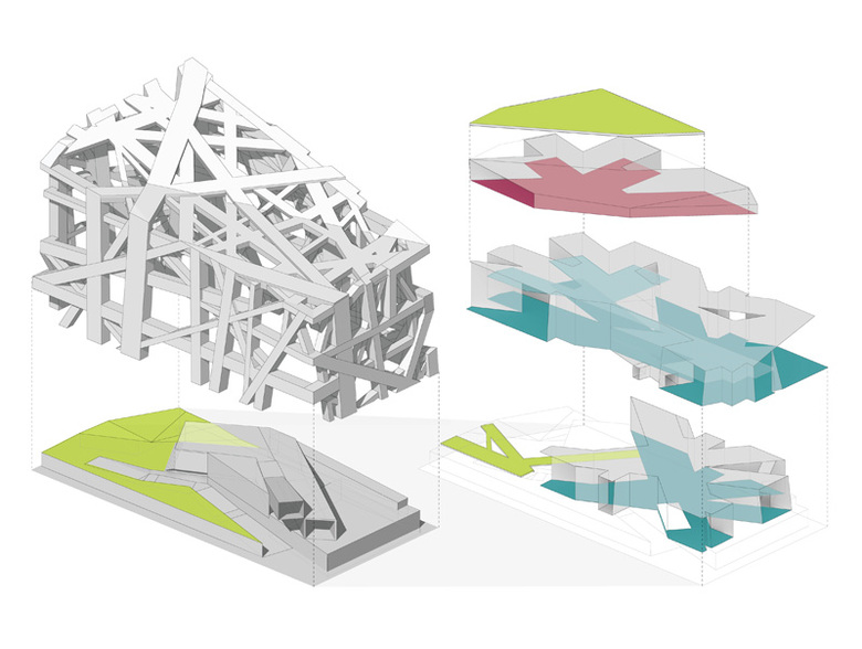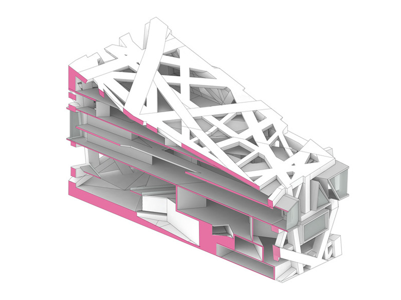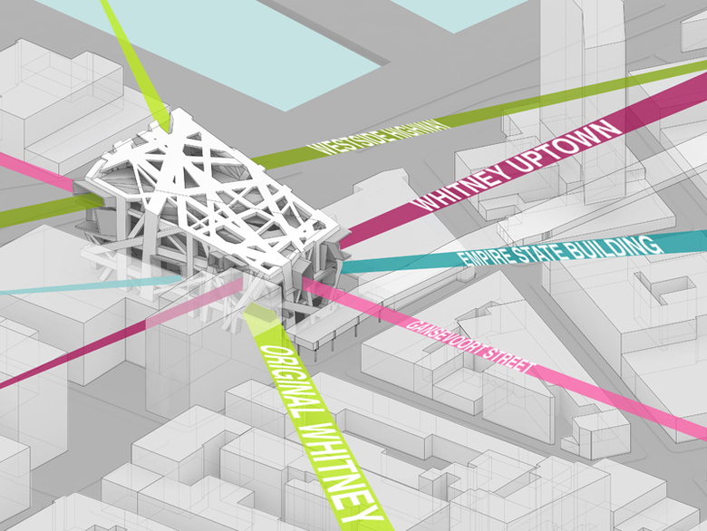Why shouldn’t a museum building be as inspired and exciting as the art it holds? Why are we perpetually conceiving them as collections of white boxes locked within a grid structure? Axis Mundi breaks free of this form with its self-initiated proposal for the Whitney Downtown, experimenting—like all good art—with a more creative and challenging design. A dramatically irregular superstructure constitutes a perimeter lattice that conceals staircases, escalators, elevators and mechanical rooms. Column-free glass galleries are suspended like bridges from this lattice. In this way, the building more closely mirrors the actual creative process. We can imagine the irregular superstructure as the chaotic consciousness of the artist, within which ideas (the galleries) arise spontaneously and float freely, eventually falling into some sort of order within the matrix of the mind and coming to fruition on canvas, video, in three-dimensional sculptural form and other infinitely original ways. As John Beckmann says, “We imagine the contemporary museum to be a dynamic environment—a space that is less a container and more of a conduit.”