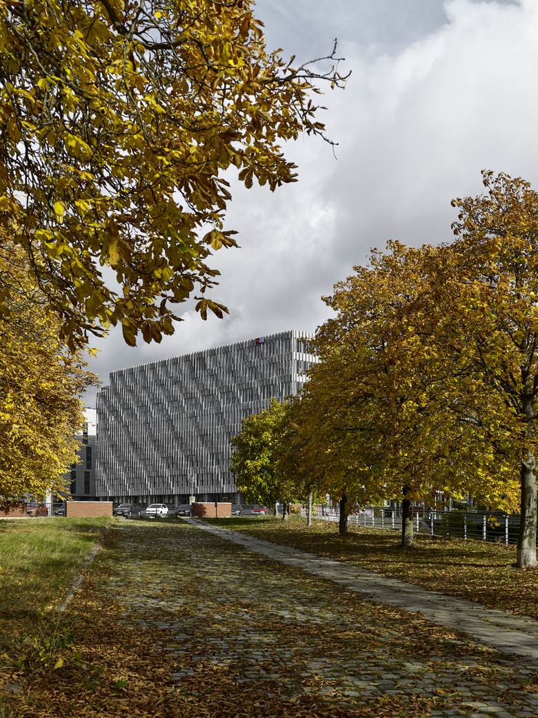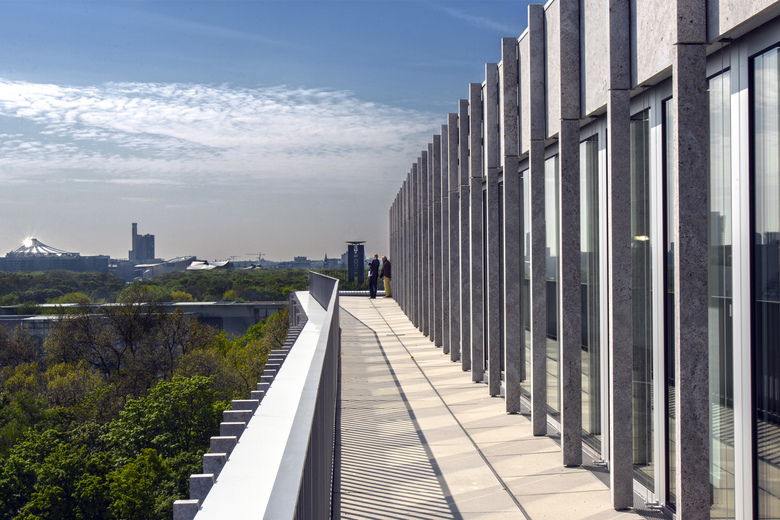 konstruktion eine Aluminium-Bandraster-Fassade mit natursteinverkleideten Brüstungsbändern vorgehängt, die von schmalen, vertikalen Naturstein-Finnen überlagert werden. Nur 8 cm breit und einem schnellen Rhythmus von 67,5 cm folgend, überziehen diese den Baukörper wie ein leichter, eleganter Vorhang - anders als bei einer Lochfassade treten die Öffnungen so eher in den Hintergrund. Die Finnen sind über Stufen von je 1/3 Geschosshöhe in der Tiefe variierend gestaffelt und bilden so einen diagonalen Verlauf, der der steinernen Hülle in einer umlaufend fließenden Bewegung die Schwere nimmt. Es entsteht ein abstraktes Fassadenbild, das mit seiner dynamisch changierenden Struktur je nach Blickwinkel mal offen, mal geschlossener wirkt und aus der Ferne fast zu flirren scheint.