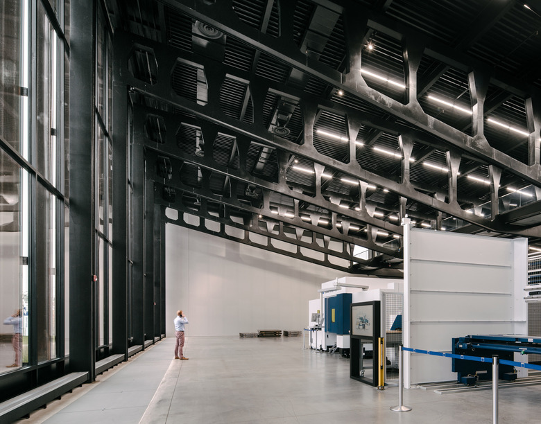 The factory and the exhibition space – ordinarily, these two project types would lie worlds apart for an architect. With one, functionality and cost-efficiency reign; with the other, the highest demands are placed on design and quality of execution. A new presentation and sales center for the German machine tool and laser manufacturer TRUMPF near Chicago combines both worlds and turns high-tech machines and innovative production processes into exhibition-like showpieces. Here, an Industry 4.0 demonstration factory fitted with digitally networked machines presents the entire sheet metal process chain, from ordering a sheet metal part to its design, production and delivery, experienced as an intelligently interlinked, holistic process.