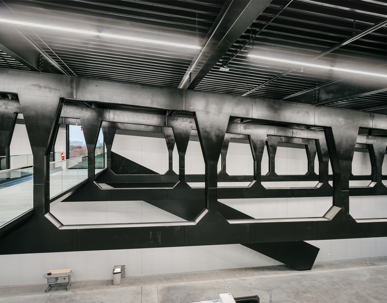 The showroom is spanned by eleven customized, laser-cut steel trusses, approximately 45 m long. Visitors are given a special overview via an open “skywalk”, a bridge that runs through the ceiling structure, thus enabling one to perceive the filigree “structure as space”.
