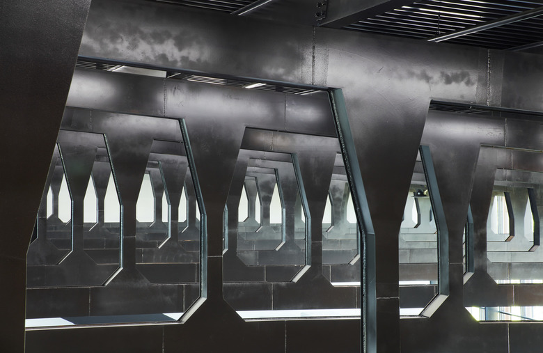 The building’s exterior, with its rough cladding of deep rust-colored corrugated Corten steel sheeting and its elegant, floor-to-ceiling glazing, emphasizes both its industrial context and its representative function. Inside the building, raw, industrial materials with refined surfaces establish a warm, almost homey atmosphere. The construction of black steel, polished concrete floors, expanded metal mesh panels and charred wood walls characterize spaces where industrial production and exhibition are coherently integrated.