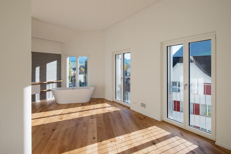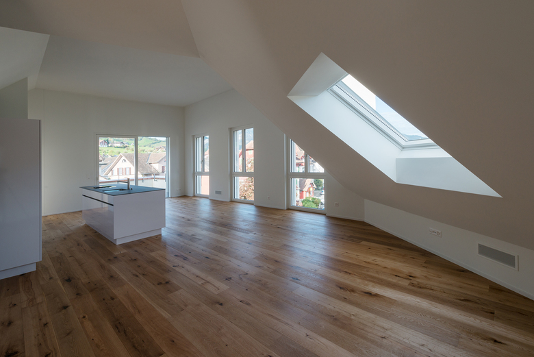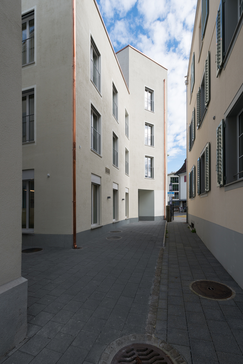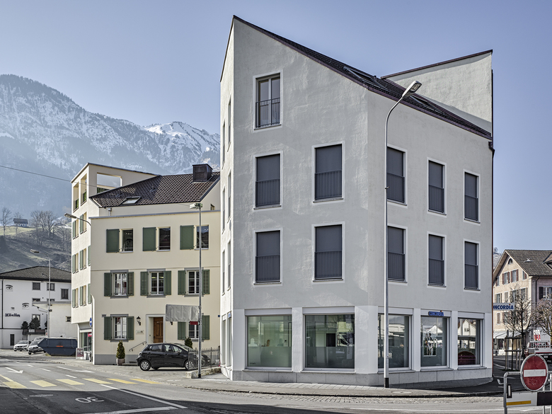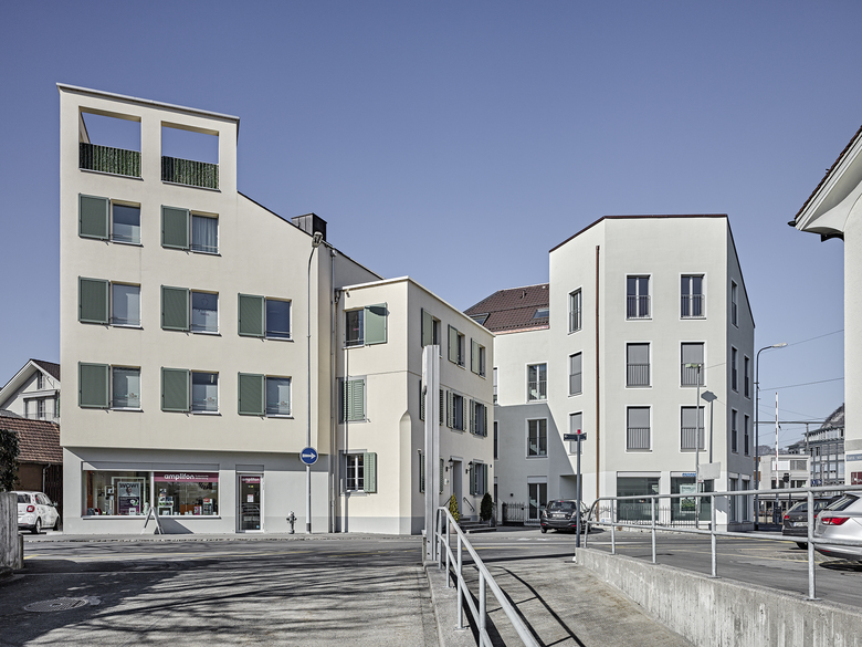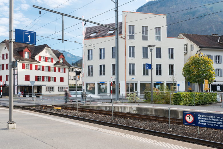 Die bisher unbebaute Parzelle am Stanser Bahnhof bildet den Auftakt zum historischen Dorfkern. Die komplexe Volumetrie reagiert selbstbewusst auf die unterschiedlichen kontextuellen Bezugspunkte. Mit Fassadengestaltung und Farbgebung reiht sich das Gebäude aber zurückhaltend ein.