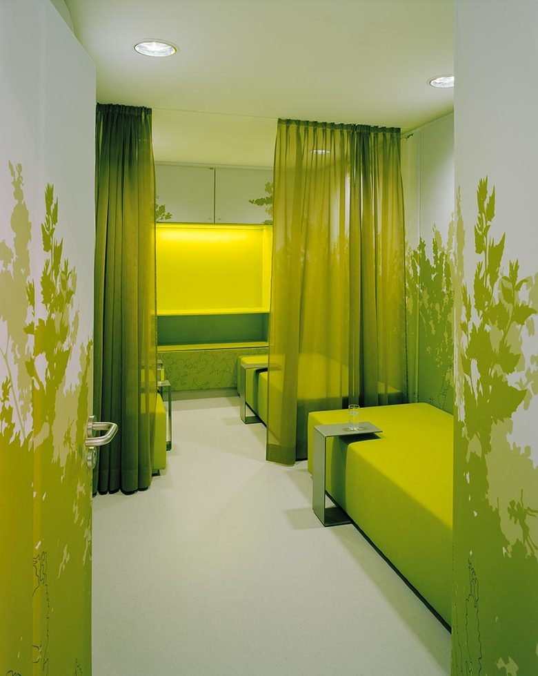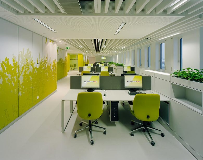 The decorative outer walls of the interior spaces – imprinted with the green park motif – function as the most important acoustical absorber. At the same time they are removable and allow the employees to determine the level of communication of concentration needed for performing the tasks effectively.