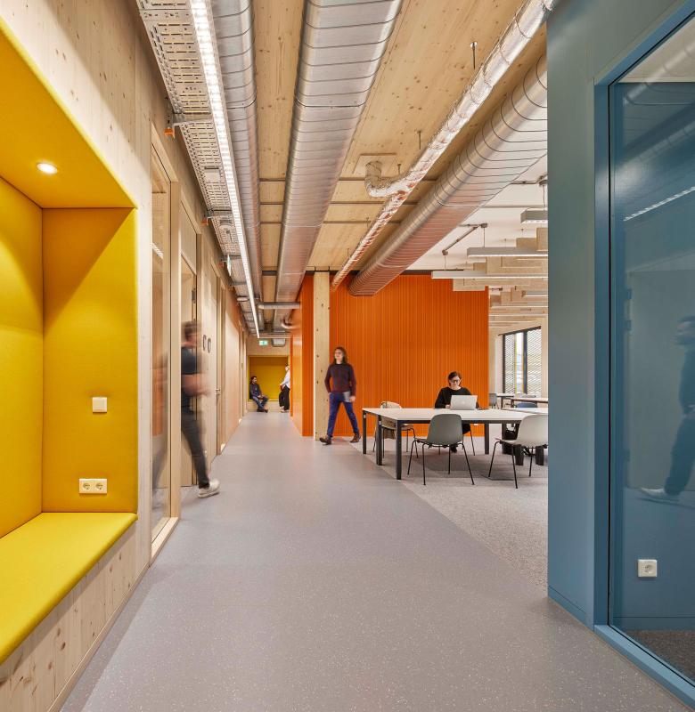 With renewable building materials and resource-saving use of existing infrastructure, Münster University of Applied Sciences has expanded the Fachhochschulzentrum (FHZ) on Corrensstraße. Behnisch Architekten, in collaboration with Berghaus Architekten, has planned a new upper floor in timber construction that complements the existing building, built in 1974 and renovated in 2014. The interior clay ceiling has both a cooling and warming effect and naturally regulates the humidity in the rooms. On the outside, the roof will be covered with a photovoltaic system and additional greenery, preserving the natural water balance and increasing biodiversity.