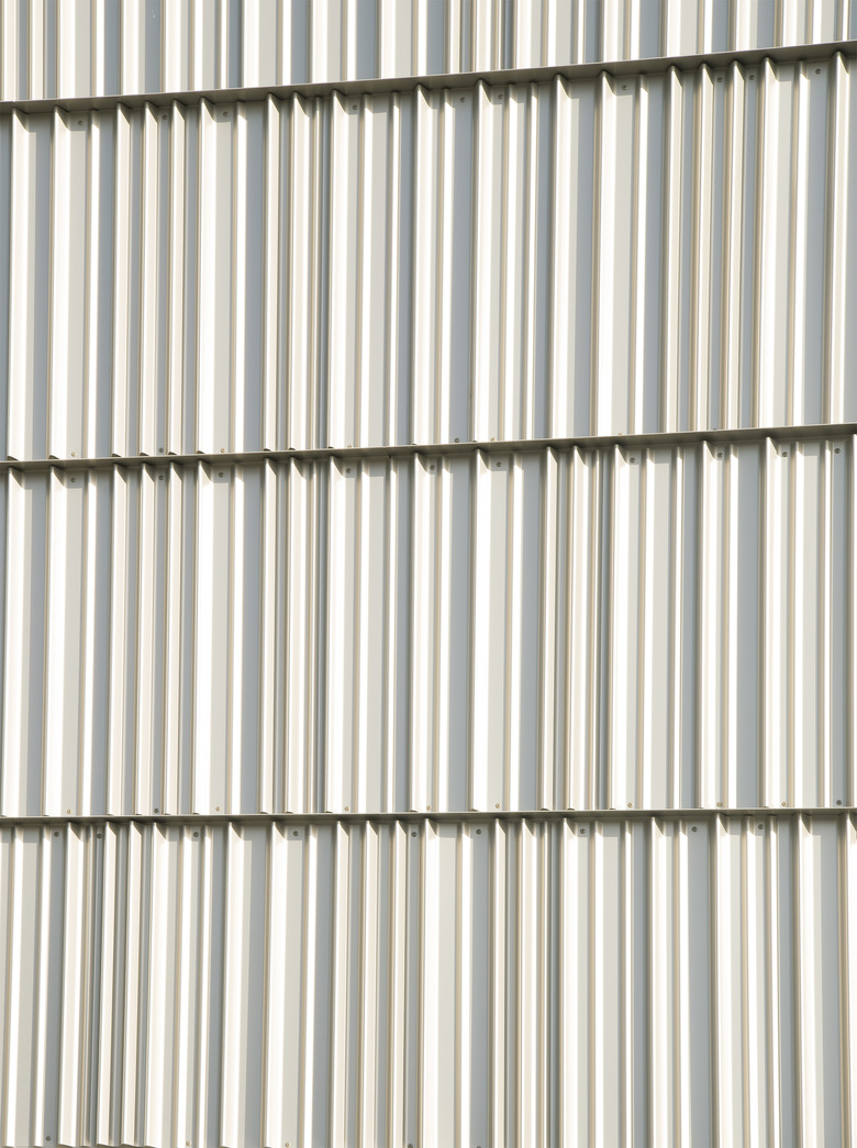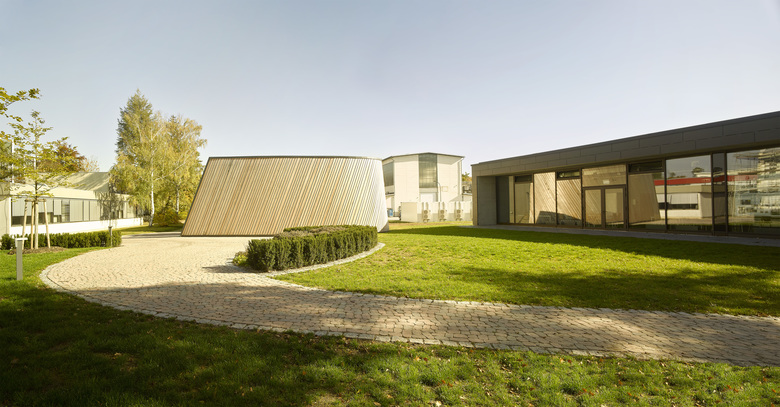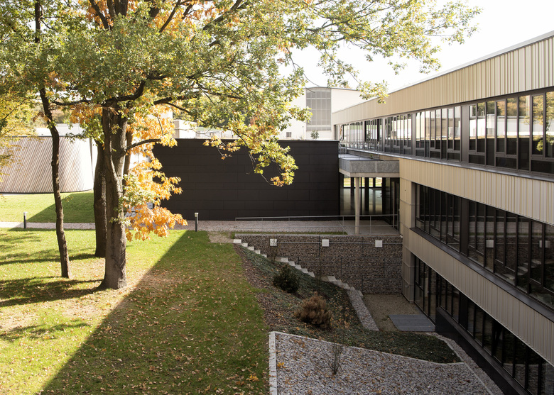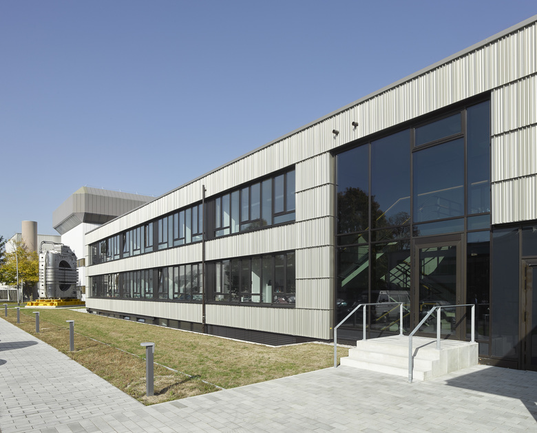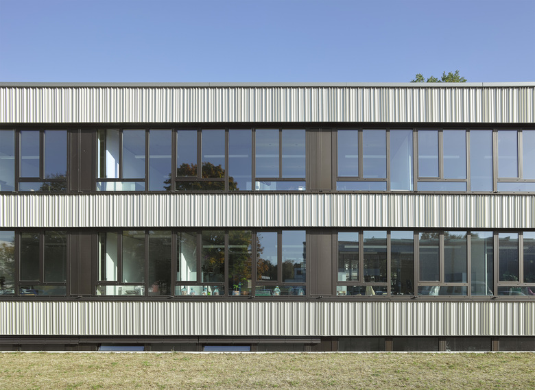 Sheet metal and fiber-cement facades emphasize the usages within: the offices and lab rooms, lecture and seminar rooms. A vertical metal façade which is individually folded is drawn as strips across the entire length of the building volume. The bright color of the metal creates a pleasing contrast to the dark fiber-cement façade of the teaching and seminar rooms which accentuates the stretched shape of the building with its vertical orientation.