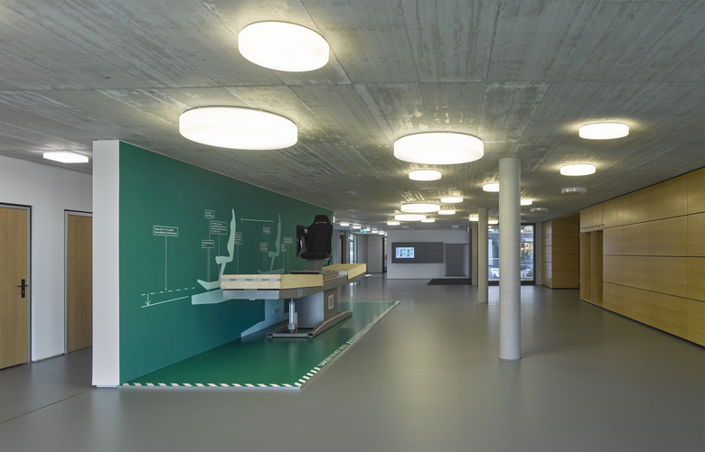 Fair-faced concrete surfaces underline the technical nature of the rooms. The partitioning walls at the lower floor consist either of faced lime sandstone brick walls or high-quality wood. Both are contrasted with delicate glazed partitions which run along the corridors and visually unite the different spaces and provide natural light.