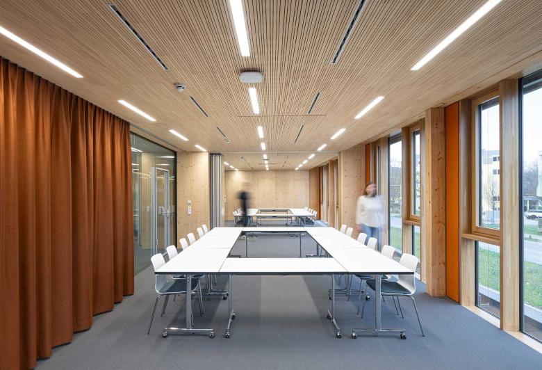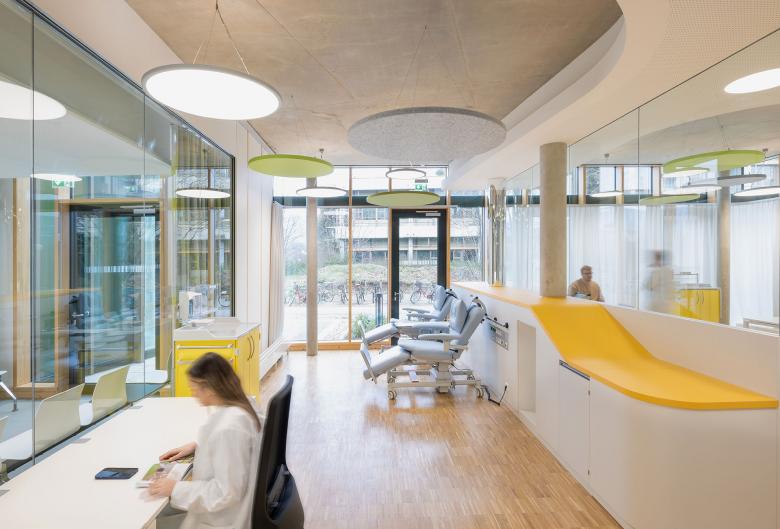 The new timber administration building contributes to the campus’s inviting atmosphere. Its bright interiors, the natural scent of wood, and a colorful felt-lined interior facade offer a sensory experience that softens the clinical context and evokes a domestic feel. Except for the basement, the entire building is constructed from timber, using cross-wall laminated timber plates (20 cm internal walls, 16 cm floors), serving as a sustainable addition to the existing structures. Operable windows allow for natural ventilation, and daylight is maximized throughout the design.