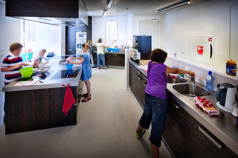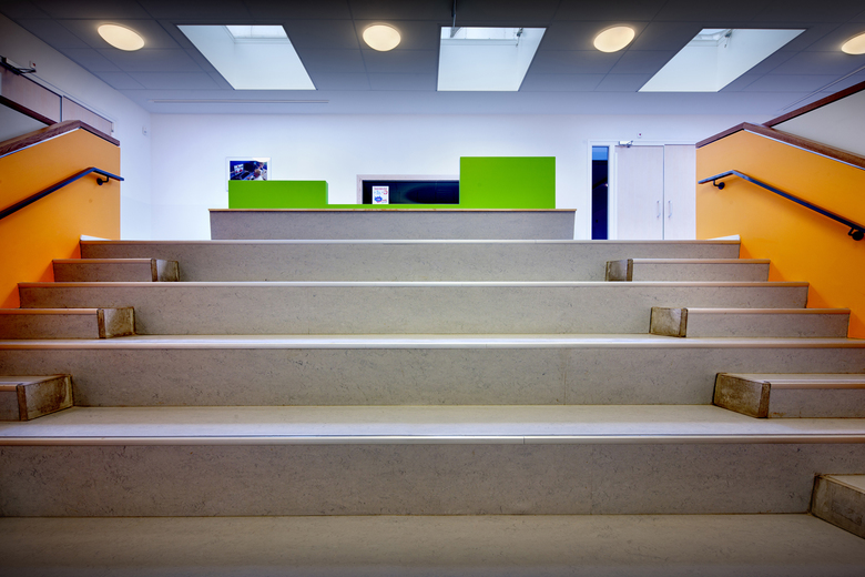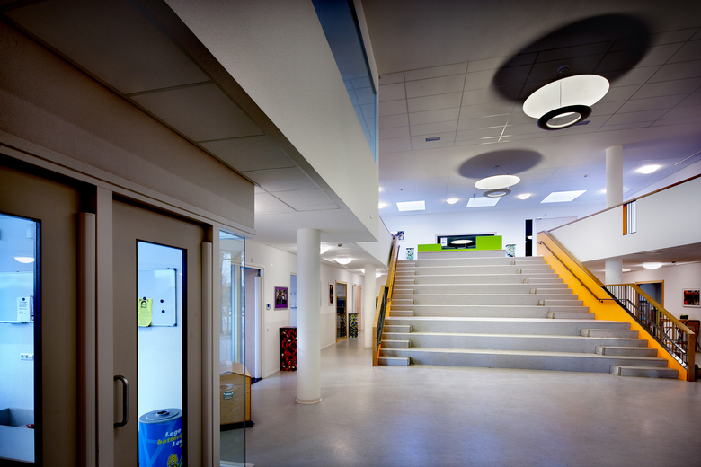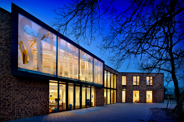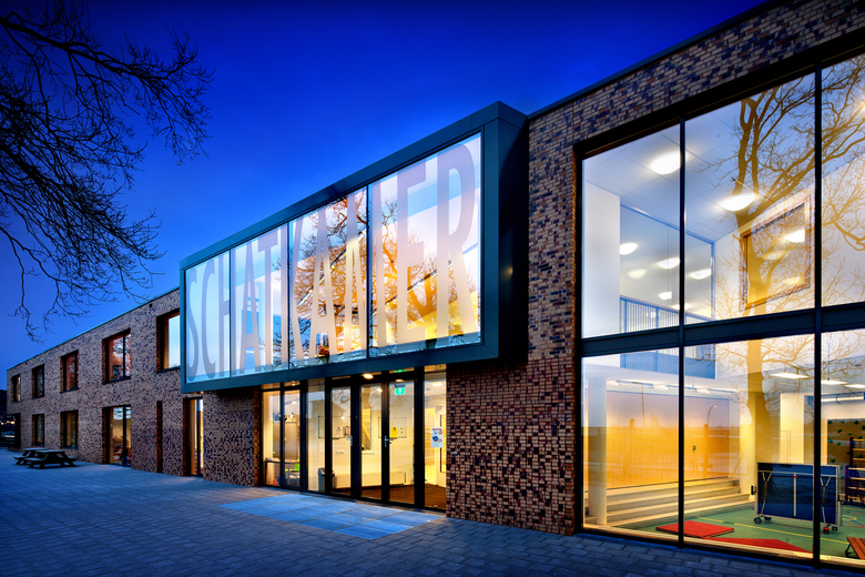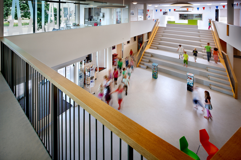 The primary school 'De Schatkamer' is located in the Stadshagen district in Zwolle, and is surround by the Belvederelaan, the Wildwalstraat and a railway track. There is a series of magnificent oak trees on the site. The building follows the contours of the land in a kind of bow shape, so that the historic oak trees could be kept. The program consists of a primary school in two layers for approx. 500 pupils. The school is set up according to the educational concept for a new way of education, called ‘Natural learning’. Also located in the building is a children's centre with nursery, kindergarten and after school care on the ground floor. The school is divided into 5 units, surrounding a central hall. The huge stairs in the central hall can also function as a theatre. Several special functions are located around the hall, such as kitchen, playroom and meeting rooms, so that the space can be used in many different ways, forming the beating heart of the school. Roof lights and windows ensure that the hall is filled with light. Through the adjacent rooms, the surroundings can be seen, and specifically the view of the majestic oak trees brings nature into the building. From the central hall, all units can be reached, and views through the hall ensure a spatial and transparent appearance. The units each have a quiet area with computer workstations and areas for quiet work and a busy area where a workshop space, atelier and childrens cafe are located. The ambiguous form of the building and the orientation within the building ensures each unit has its own quality and identity, which is further reinforced by differentiation in material and color. Every unit has it’s own colour scheme with bright fresh colours, which gives each space its own character and identity. Specially designed interior elements are incorporated in the building, for sitting, playing and storage. Low windows make it possible for even the smallest children to have a custom-made view through the building, a glance through their learning landscape.
