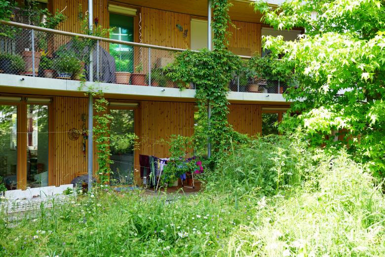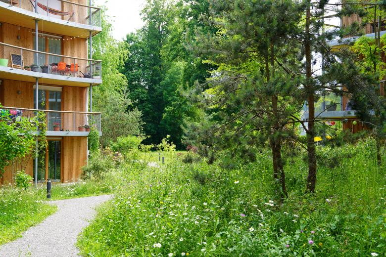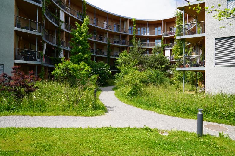 Die ovalen Innenhöfe sind einfach gehalten und zeichnen sich durch eine sanfte Terrainmodellierung aus, um einerseits eine möglichst gute Basis für Baumpflanzungen über unterbauten Bereichen zu gewährleisten, anderseits die dahinterliegenden Privatbereiche zu schützen. Verschiedene Baumarten bilden einen feinen Raumvorhang zwischen den Wohnungen. Kletterpflanzen wachsen an der Balkonschicht empor.