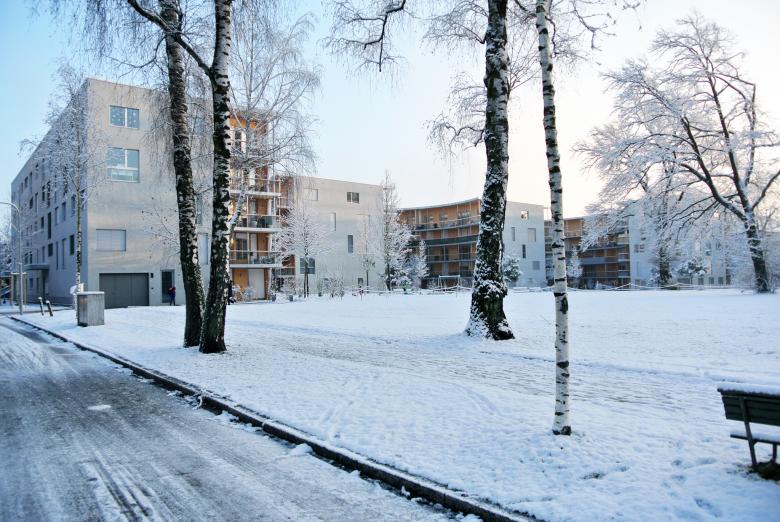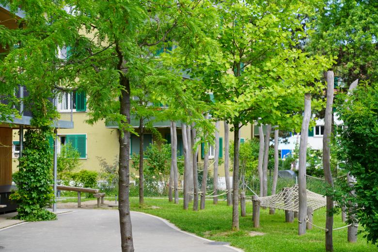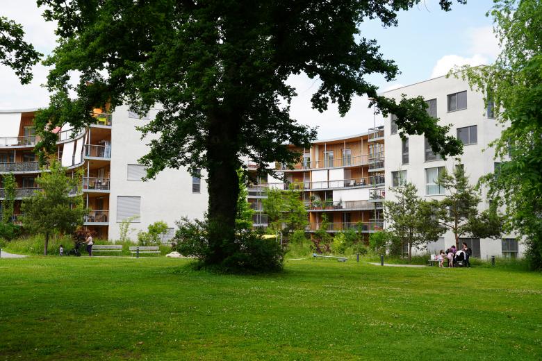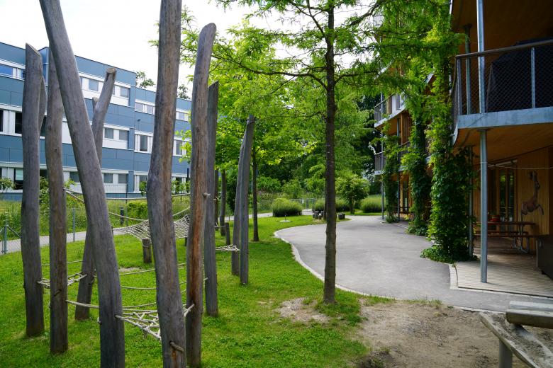 Die Gebäudefigur wurde durch Verschiebung der im Süden unmittelbar vorgelagerten, öffentlichen Grünfläche möglich. Dadurch ist ein einmaliger, attraktiver Verbund zwischen der Wohnsiedlung und der kleinen Parkanlage mit ihrem sehr schönen Baumbestand gelungen. Geschwungene Wege führen durch die Grünflächen hindurch und betonen die parkartige Situation. Daran angelagert befinden sich Angebote für Aufenthalt und Spielbereiche sowie Abstellmöglichkeiten für Velos.