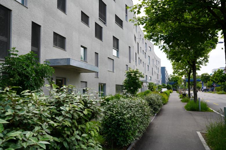Zwischen dem Trottoir entlang der Regensbergstrasse und den Parterrewohnungen schützt ein mit Sträuchern und Heckenstreifen bepflanzter Vorgartenbereich. Darin befinden sich die Hauszugänge und weitere Veloabstellplätze.