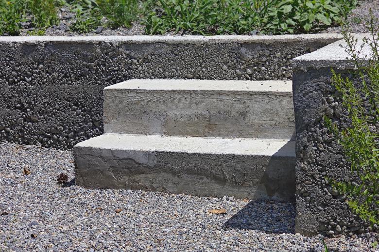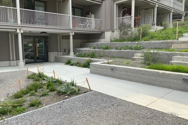 Drei Stampfbetonmauern terrassieren den Hof nach Osten und verbinden ihn zum höherliegenden Grünraum mit Kleinkinderspielplatz am Waldrand. Die extensive Wiese mit Sickermulden für die Gebäudeentwässerung integriert das gesamte Neubauensemble in die umgebende Siedlungslandschaft.