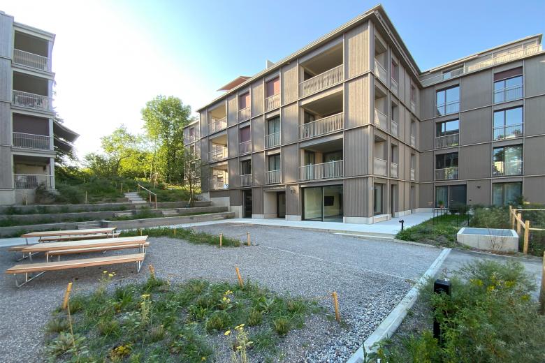 Der zentrale, unterbaute Hof übernimmt die Erschliessung und bildet das verbindende Zentrum der beiden Wohnbauten. Ortbetonplatten umlaufen den gemeinschaftlich nutzbaren Kiesplatz. Durch seine robuste Materialität und orthogonale Formgebung ist er gut und flexibel nutzbar und versteht sich als aussenliegende Ergänzung zum Gemeinschaftsraum und den Wohnungszugängen im Erdgeschoss.