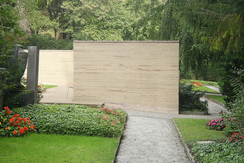 Die gewählten Materialien nehmen auf unterschiedliche Weise Bezug zur Grabstätte: Stampflehm als verdichteter Zustand von Erde, dem letzten Ruheort. Sowie als Metapher von Werden und Vergehen.