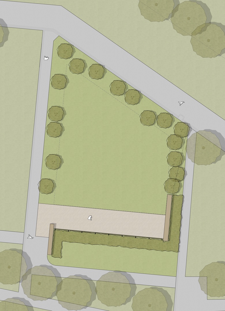 Die Gemeinschaftsgrabanlage nimmt diese auf und formt darin einen intimen Raum. Dieser unterteilt sich in den Aufenthaltsbereich am unteren Rand des Geländes und das aufsteigende Urnenfeld.