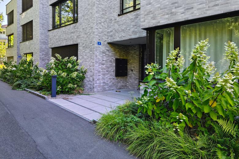 Eine robuste Mischstaudenpflanzung mit Hortensien sorgt entlang dem Singerweg für die notwendige Distanz zwischen dem engen Strassenraum und der Fassade.
