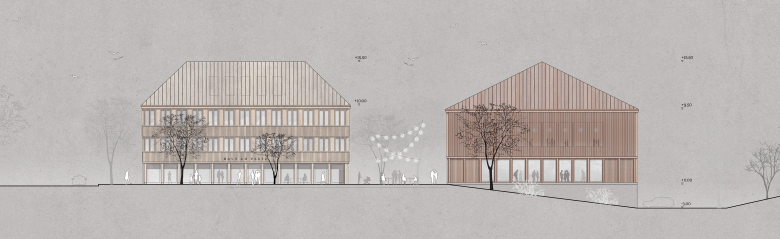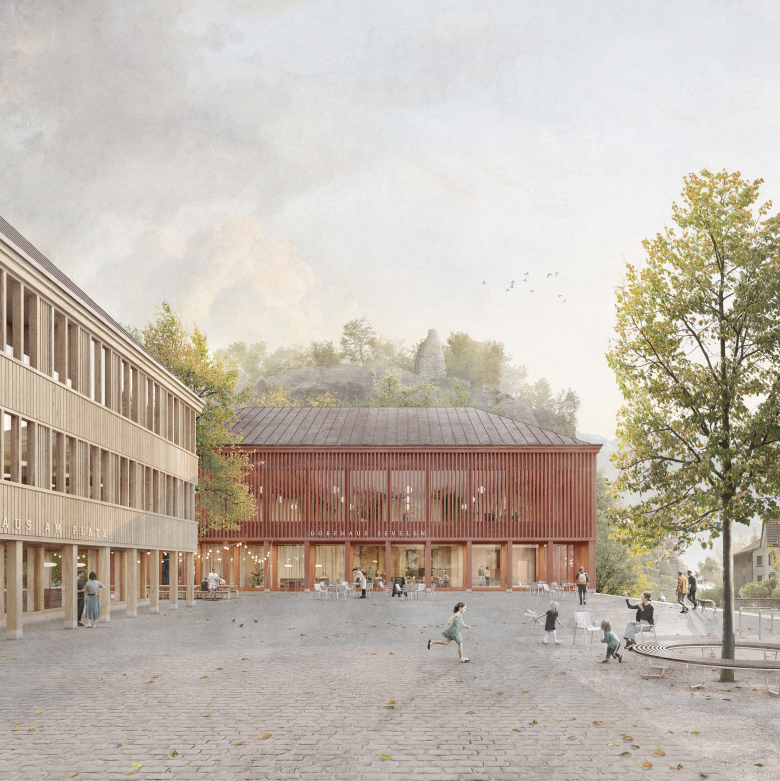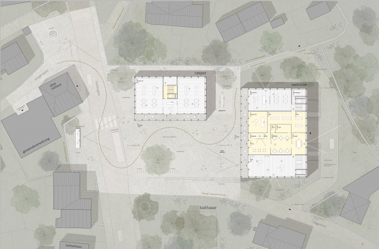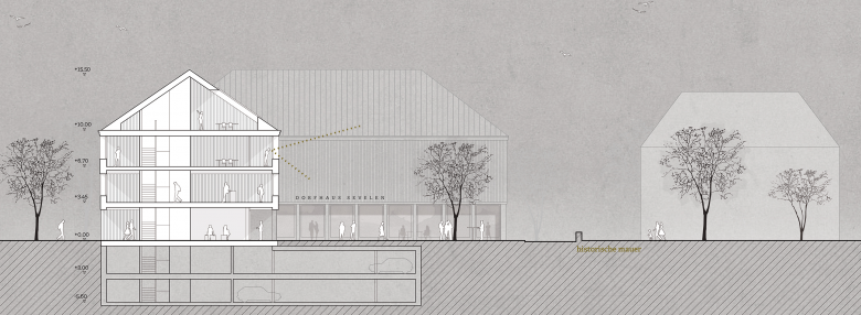 Es definiert sich ein atmosphärisches Platzgefäß. Die Positionierung des Dorfsaals schafft eine wohltuend, sich über die Platzdiagonale erstreckende, vis à vis Situation zum administrativen Zentrum. Er bildet damit einen gesellschaftlichen und kulturellen Mittelpunkt. Übergeordnetes Ziel ist es mittels zwei neuer Passsteine eine identitätsstiftende, lebendige Mitte für Sevelen zu schaffen. Die Genese des Ortes respektierend werden die dorfräumlich prägenden Kanten der Umgebungsgebäude aufgegriffen und durch eine die Platzbildung verstärkt. Das historische Drei-Könige Areal hat dies bereits richtigerweise erkannt und einen notwenigen, gefassten Vorplatz ausgebildet. Die präzise gesetzten Volumina fügen sich durch eine feine Fassade und Baukörpergestaltung integrativ in die bestehende Struktur ein ohne sich architektonisch anzubiedern. Dies ermöglicht die Fassung eines Platzes zwischen den Baukörpern, der historischen Mauer am Baggastiel und der Hirstengass, welche sich aus Bauten unterschiedlicher Epochen zusammensetzt und all Diese geschickt untereinander vereint. Die Setzung sowie Körnung der beiden neuen Baukörper stärkt die räumliche Platzbildung und definiert somit die neue Dorfmitte in Sevelen. Die neue Dorfmitte erhält durch die zwei Körper, mit dem Ort vertrauten Walmdächer, Volumen mit zeichenhafter Anmutung und schafft eine neue identitätsstiftende Adresse im Zentrum von Sevelen. Die entsprechend repräsentative Bauplastik stellt die Neubauten und das Rathaus in direkten Bezug zueinander. Durch ein öffenbares, zum Dorfplatz spielendes Foyer im Dorfhaus, sowie die um den Platz orientierte Mantelnutzung entsteht eine intensive und lebendige Wechselbeziehung von Innen und Aussen.
