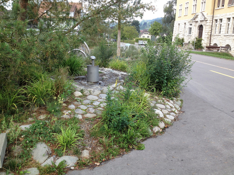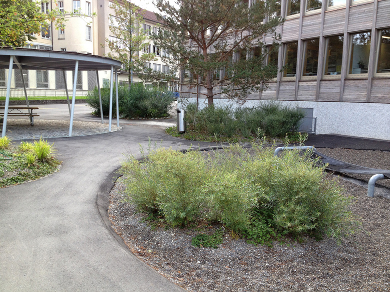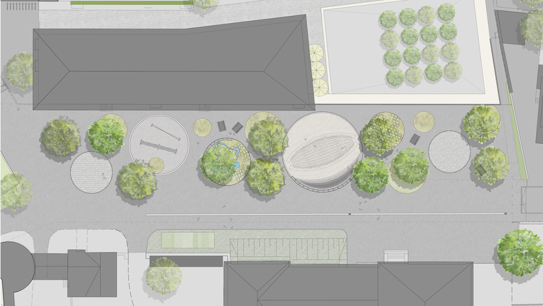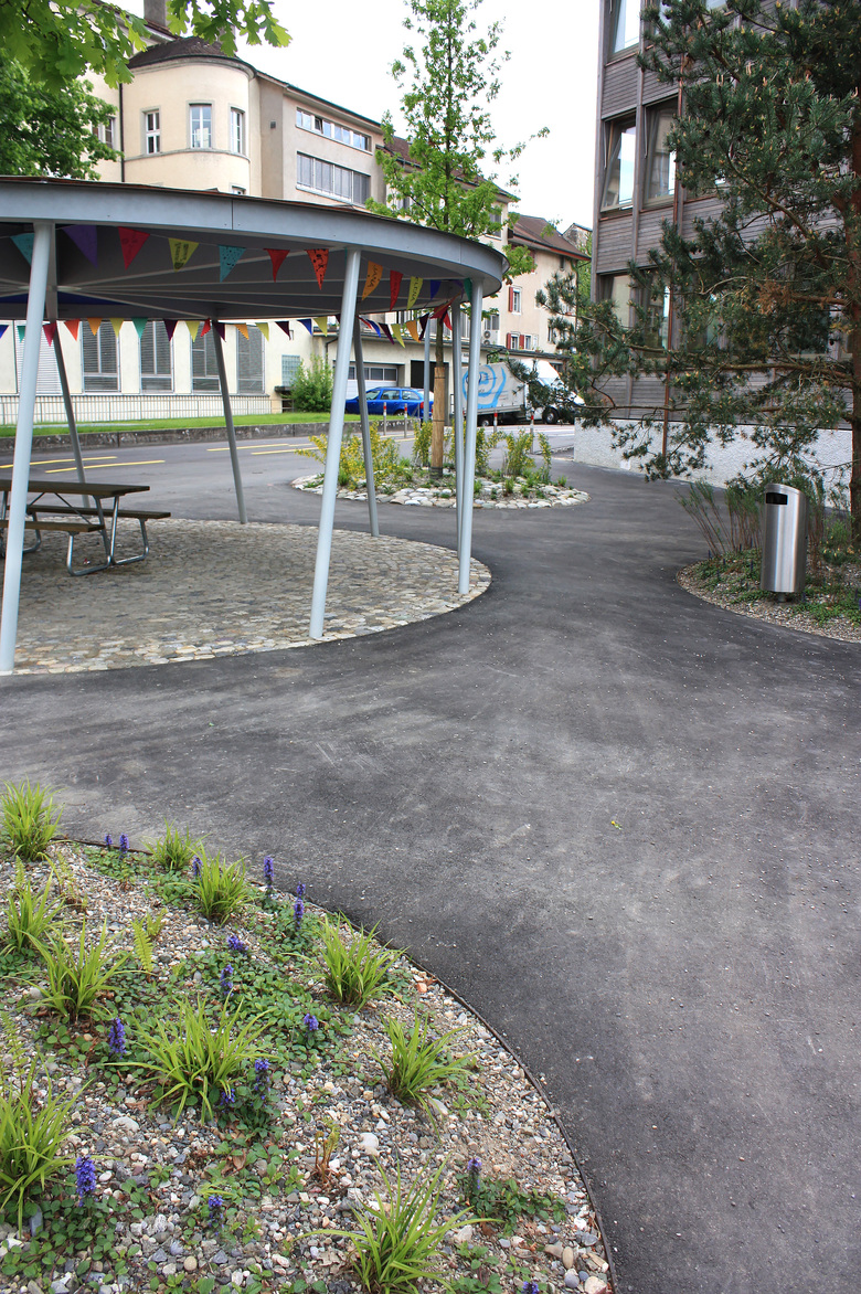 Die vormalige Strasse wird - eingeebnet und verkehrsberuhigt - zu einem langezogenen, grossräumlichen Platz, der weiterhin vom öffentlichen Velo- und Fussgängerverkehr gekreuzt wird. Parallel dazu sind alle konkreten Nutzungsangebote unter einem lockeren Baumdach zusammengefasst und bilden einen kleinräumigen, durchlässigen Bereich des Pausenplatzes.