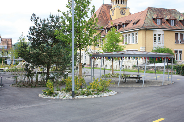 Die Neuordnung der benachbarten Parzellen der Stadt Brugg und des Schweizerischen Bauernverbandes ermöglichte die Neukonzeption des öffentlichen Raumes sowie die Integration des Pausenplatzes.