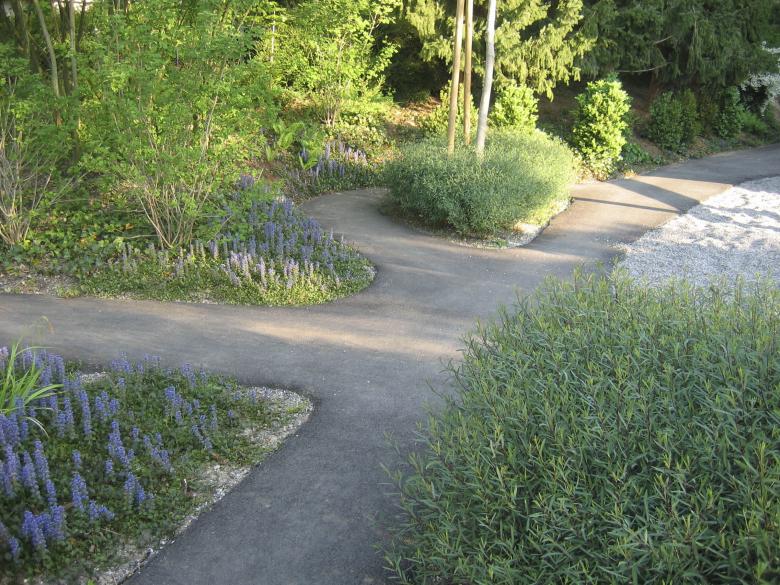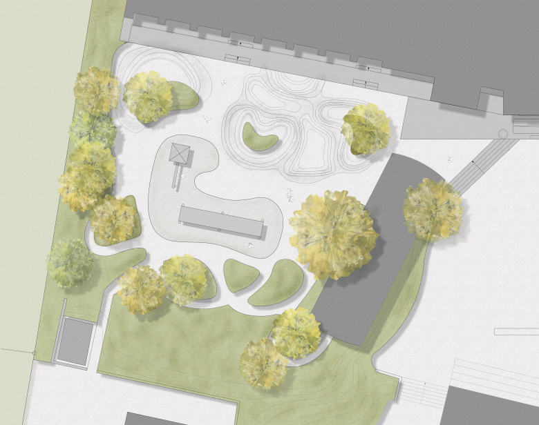 Die Belagstopographie und -geometrie schlängelt sich wellenförmig über den Platz, Purpurweidenschollen scheinen darin umher zu treiben und verstreute Koelreuteria-Hochstämme legen über alles ein feinblättriges Schattenspiel.