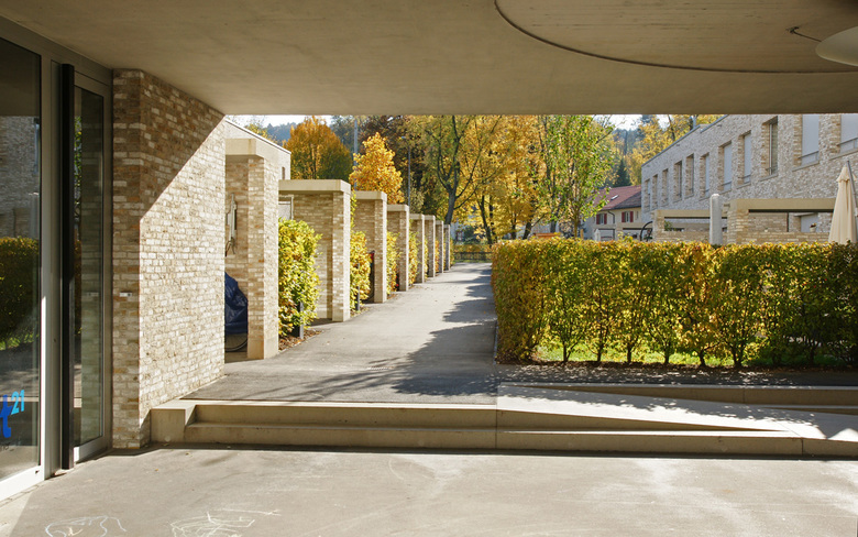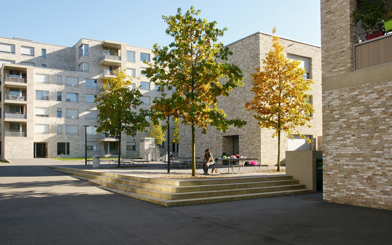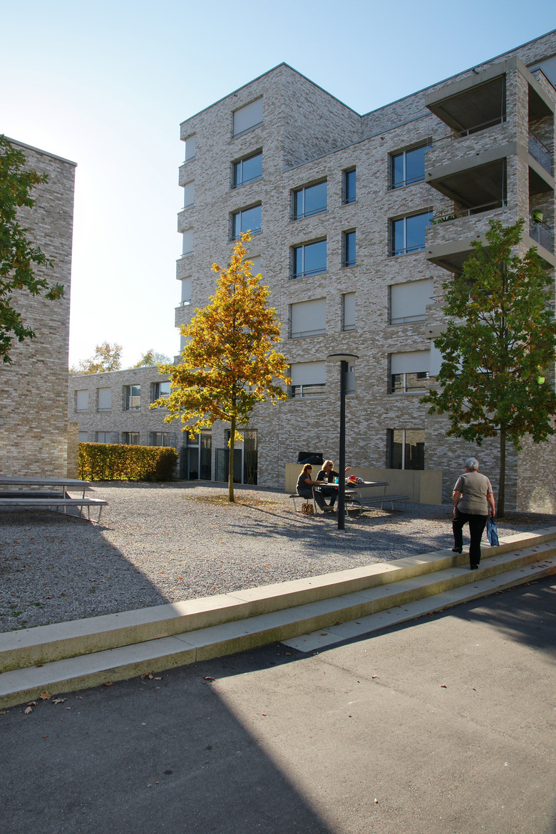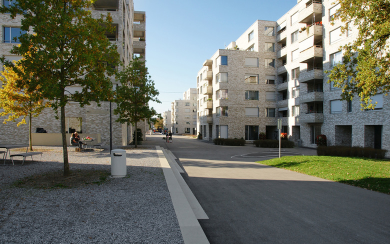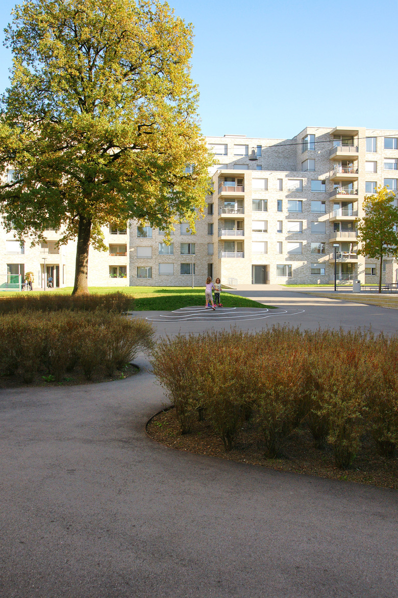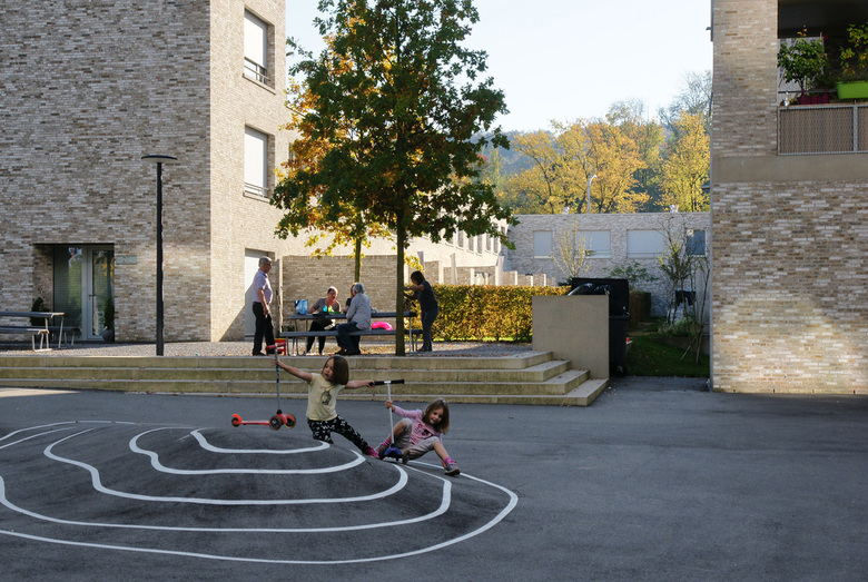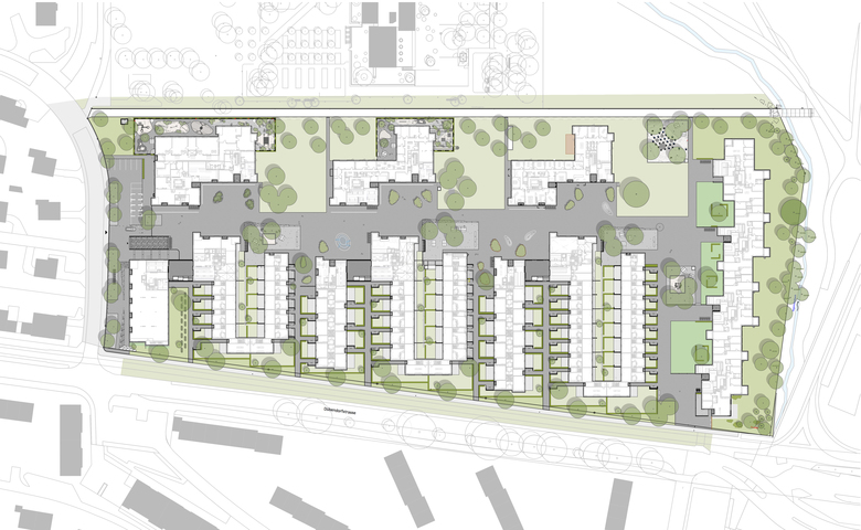 Da Hauszugänge und öffentliche Erdgeschossnutzungen bewusst auf das Zentrum der Siedlung ausgerichtet sind, kann zwischen den grossen Baukörpern gemeinschaftliches Leben entstehen. Die Qualität der Freiräume besteht in der Vielfältigkeit. Die Siedlung weist parkartige Bereiche sowie kleinteilige Gartenwelten auf, die sich in der Ausrichtung an den bestehenden Strukturen orientiert. Somit wird trotz Verdichtung ein fliessender Freiraum im Areal und über den Siedlungsperimeter hinaus erreicht.