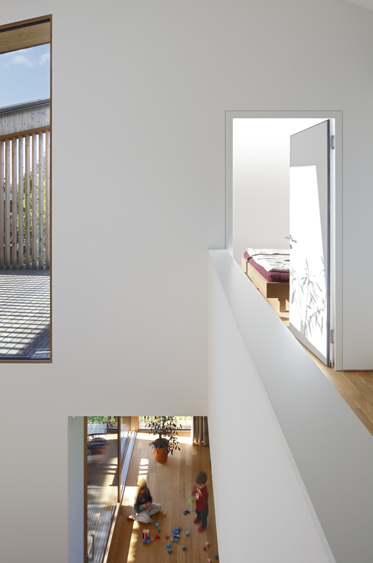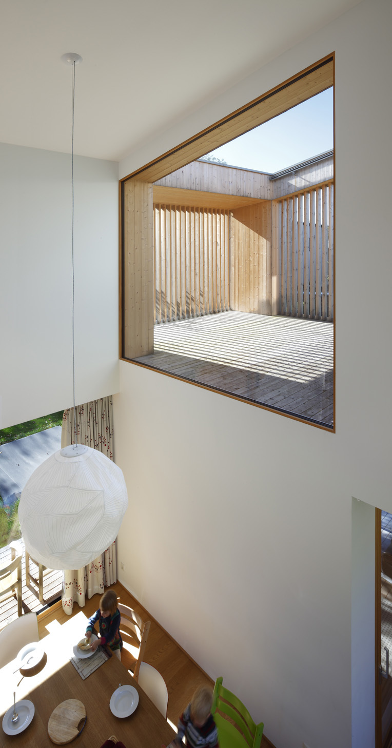 Ein Raumkontinuum um die zentrale Lehmwand verbindet über einen großzügigen Luftraum die beiden Geschoße vertikal. Filterelemente aus Holz und Textil sowie bewusst gesetzte Aus- und Durchblicke lassen ein differenziertes Spektrum an atmosphärischer Durchlässigkeit und räumlicher Intimität entstehen. Vorgelagerte Terrassen schützen vor sommerlicher Hitze und erweitern den Innenraum über großzügige Verglasungen in den offenen Gartenbereich. Ein fächerartig umschlossener Terrassenhof ermöglicht im Obergeschoß einen sichtgeschützten Aufenthalt unter freiem Himmel und bringt das Winterlicht tief in das Haus.
