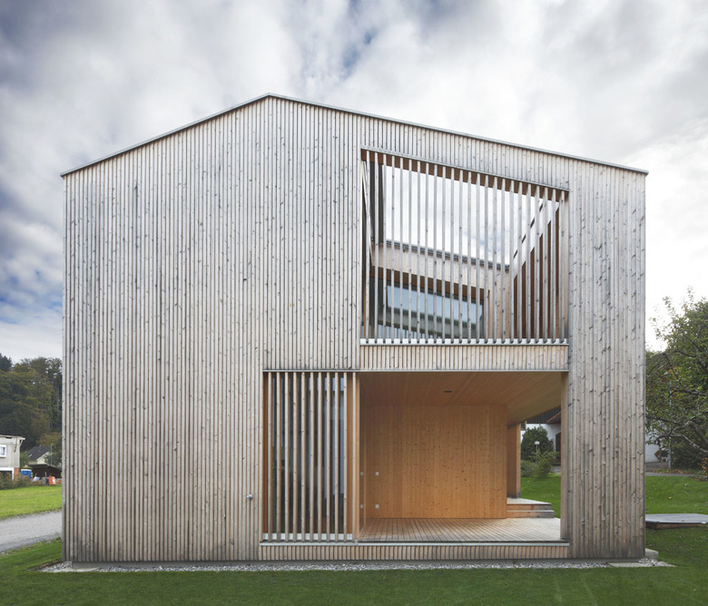 Durch die variierende Tiefe der Fassadenlattung ergibt sich je nach Lichteinfall ein lebendiges Bild der Fassade, das unbehandelte Fichtenholz erhält im Laufe der Zeit eine natürliche graue Patina.