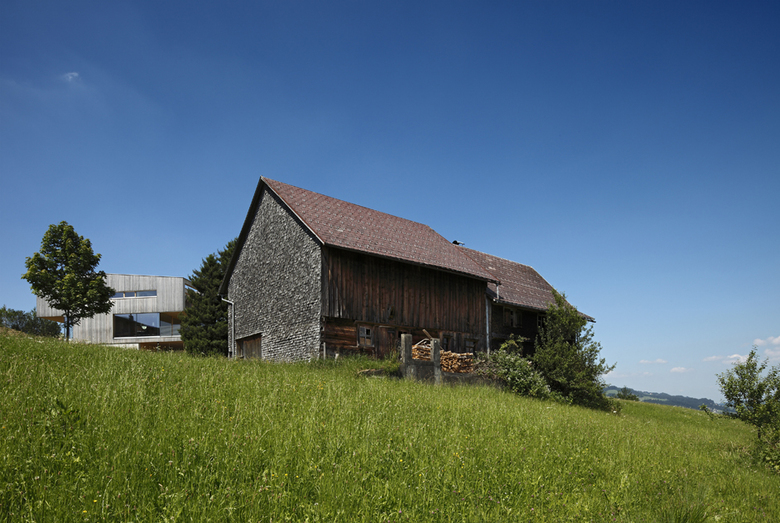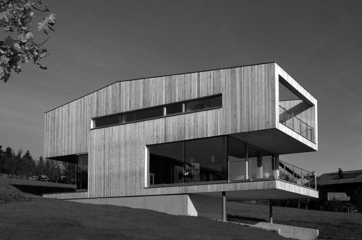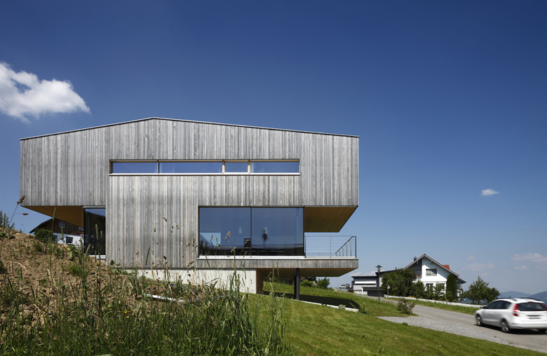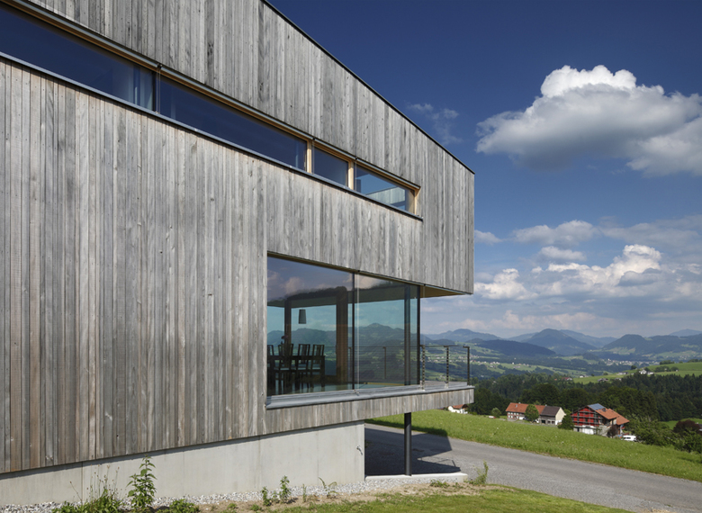 Die Hanglage eröffnet herrliche Ausblicke in den Bregenzerwald. Ausgehend von dieser Grundstückssituation ist das Haus konzipiert als einfacher Grundkörper: eingeschoben in den Hang und frei auskragend zugleich, bezieht sich die Raumfolge auf die topographischen Gegebenheiten.