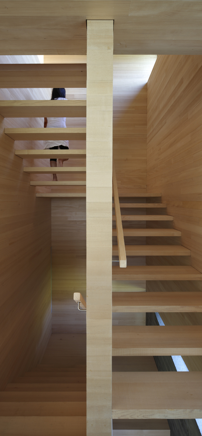 Ebenerdig gelangt man in die Eingangszone des Hauses. Entlang der Hangneigung führt die Treppe in die Wohnzone: eine offene Raumfolge von Innen- und Außenbereichen, die das Bild der weiten Landschaft in das Gebäude integriert und durch die drei Terrassen unterschiedlicher Qualität direkt erlebbar macht.