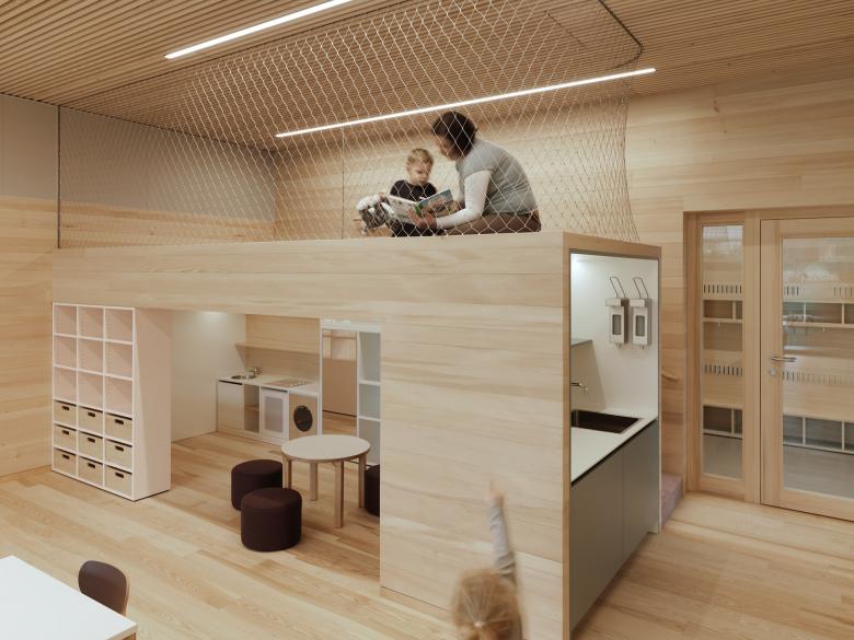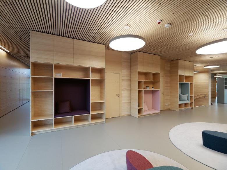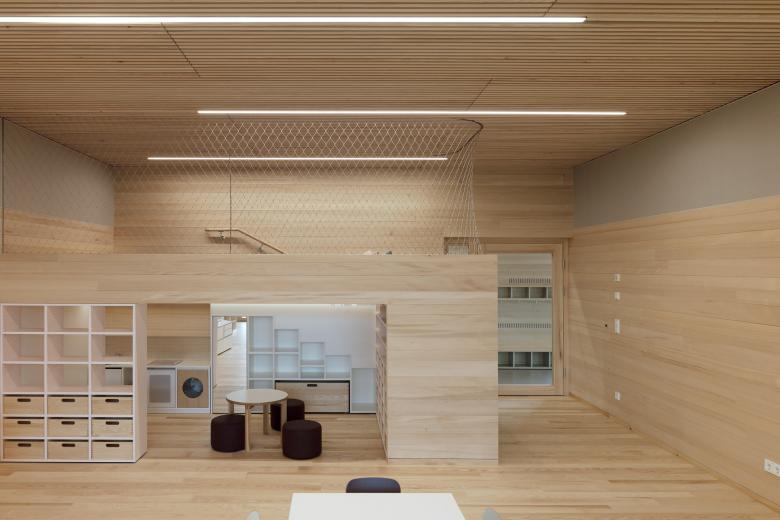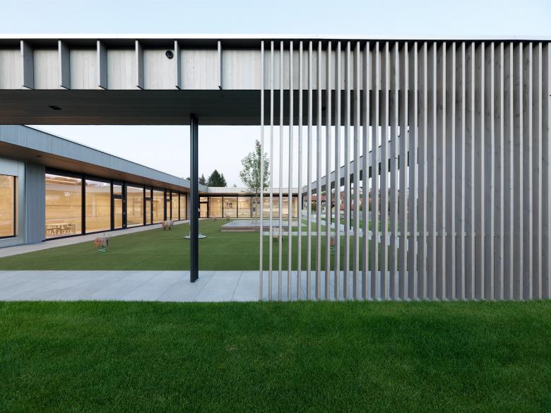 Die Räumlichkeiten des Kindergartens spannen sich L-förmig um den Spielhof auf. Die übersichtlich strukturierten Wegführungen erzeugen Klarheit, platzartige Bereiche alternieren mit privateren Zonen, die den jeweiligen Gruppen zugeordnet sind. Wie eine zweite Haut umhüllt ein silberner Holzfilter die vorgelagerten Terrassenzonen und den Spielhof, der als geschützter Außenbereich den Kindern zur Verfügung steht. Die Fassade strukturiert den Baukörper, funktioniert als Sonnen- und Witterungsschutz und bietet in definierten Bereichen nuancierte Abstufungen zwischen Offenheit und geborgenen Rückzugsmöglichkeiten. Je nach Tageslichteinfall entstehen lebendige, warme Lichtstimmungen. Die fein gegliederte Holzfassade lässt sich auch als »Neststruktur« lesen, die den Kindern Geborgenheit bietet.