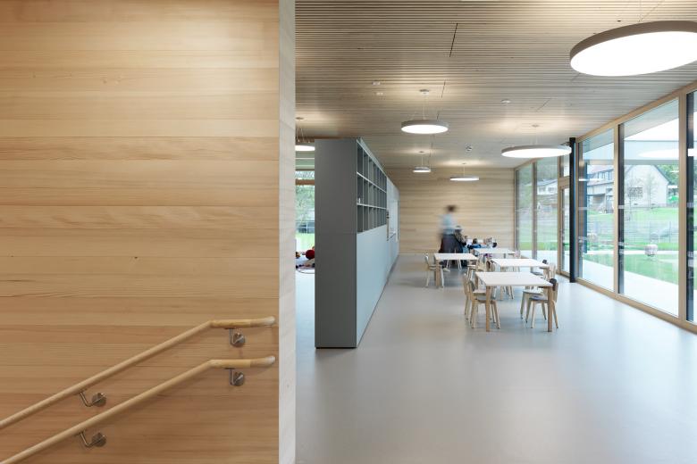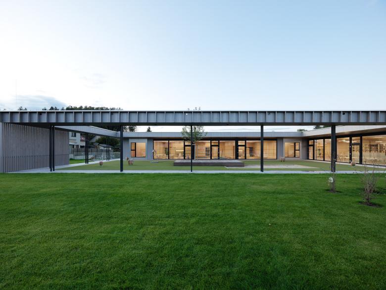 Das Gebäude nimmt den nach Norden abfallenden Hangverlauf auf und fügt sich in das bestehende Gelände ein. Der witterungsgeschützte Eingangsbereich erweitert sich platzartig unter das Gebäude, eine einladende Treppe führt direkt nach oben in die Aufenthaltsbereiche. Über den räumlich gefassten Spielhof, der südseitig ebenerdig vor den Gruppenräumen situiert ist, gelangt man auf eine großzügige Freifläche, die gemeinsam mit den Schülern der angrenzenden Volksschule genutzt wird.