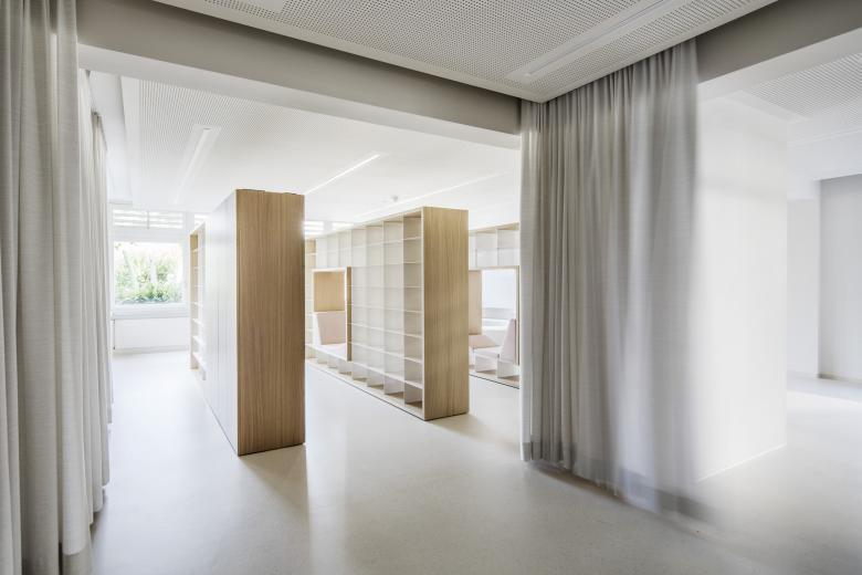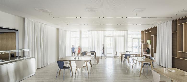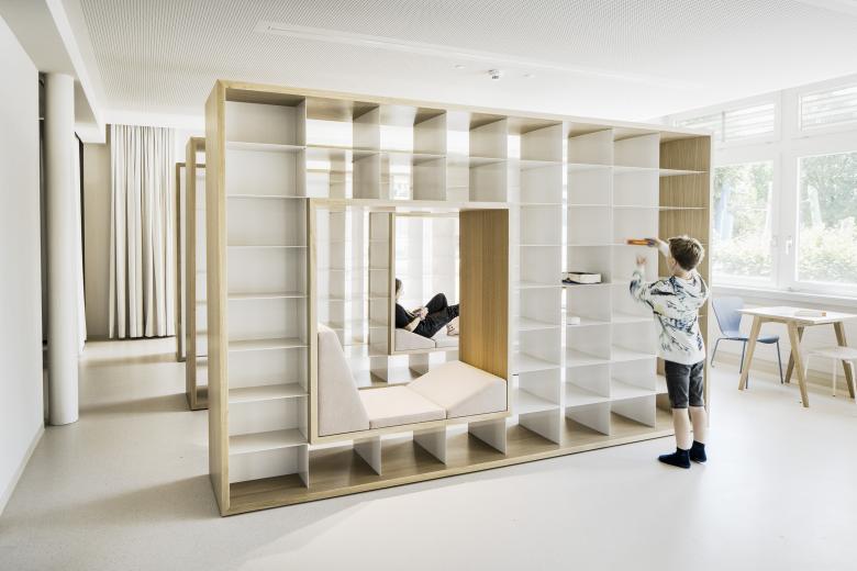 Neue Raumstrukturen für Mittagstisch und Schulkindbetreuung mit einladenden Aufenthaltsbereichen, Bibliothek und Verweilzonen in entspannter Atmosphäre - das waren die Anforderungen an die Umbaumaßnahme in der Volksschule Montfort, die derzeit von ca. 230 Kindern besucht wird. Der Bereich unmittelbar beim Eingang in die Schule und den Pausenhof erwies sich für diese Funktion am geeignetsten.
