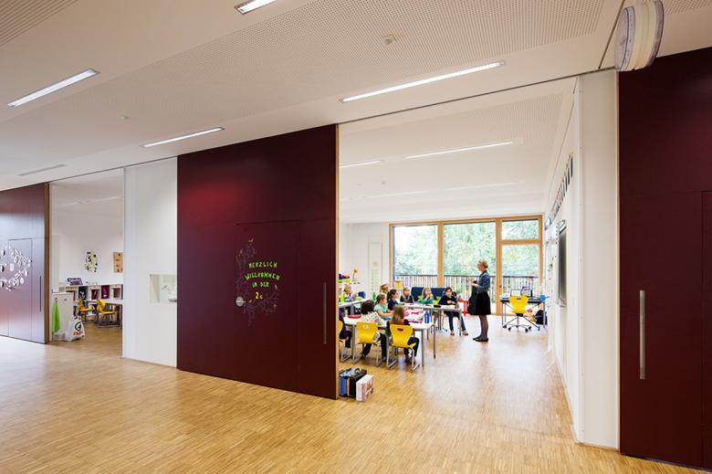 Umgesetzt sind diese Lehr- und Lernprinzipien in einem architektonischen Konzept mit offenen Strukturen im Sinne eines Clusters mit Homebases (»Klassenzimmer«) für Kinder und Lehrende sowie mit flexiblen Lerninseln, einer Freiklasse und weiteren Außenbereichen. Die Abgrenzungen durch Flure entfallen, es entsteht ein fließendes Raumgefüge.