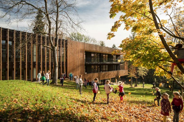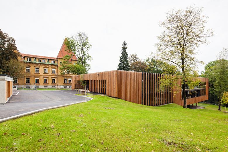 Von innen nach außen ist das Gebäude als Teil eines Ensembles mit dem ehemaligen Sanatorium – heutiger Kindergarten – und einer neu errichteten Kinderkrippe verortet. Der neue Baukörper fügt sich in Höhe, Gliederung, Proportion und Maßstäblichkeit harmonisch in die Parklandschaft ein.