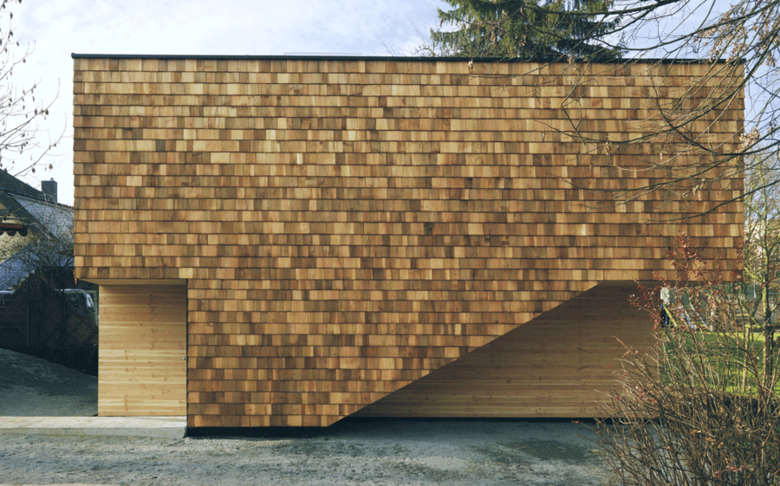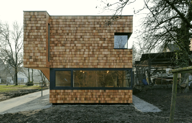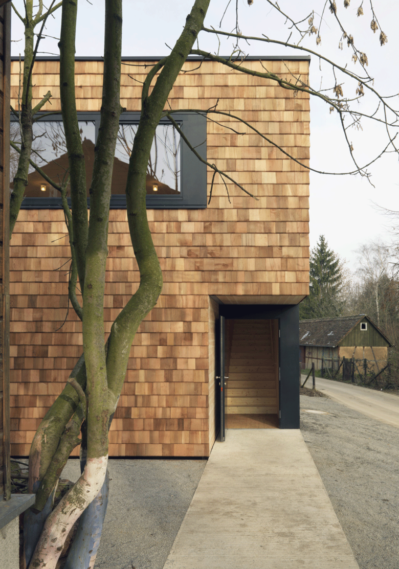 Anstelle eines zunächst vorgesehenen Anbaus an das bestehende Fachwerkhäuschen wurde ein freistehender Baukörper entwickelt, der Bezug nimmt zum Bestand und zu seinem Umfeld, indem er die Proportionen und die Materialität der umgebenden Gebäude aufnimmt, gleichzeitig jedoch mit seiner modernen Formensprache in Kontrast dazu steht. Heute markiert der Erweiterungsbau auch den Übergang zum Freispielbereich, ohne den Bestand davon abzutrennen. Dies wird unter anderem durch die nach außen markant in Erscheinung tretende Treppe erreicht, die sich in ihrer Bewegung zum Freibereich hin öffnet und in diesen überleitet. Im Inneren ermöglicht die Treppe einen Wechsel in der Orientierung der Gruppenräume.