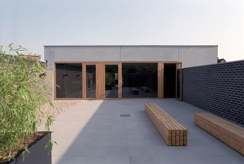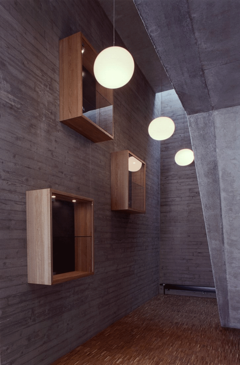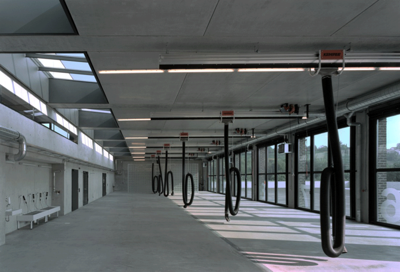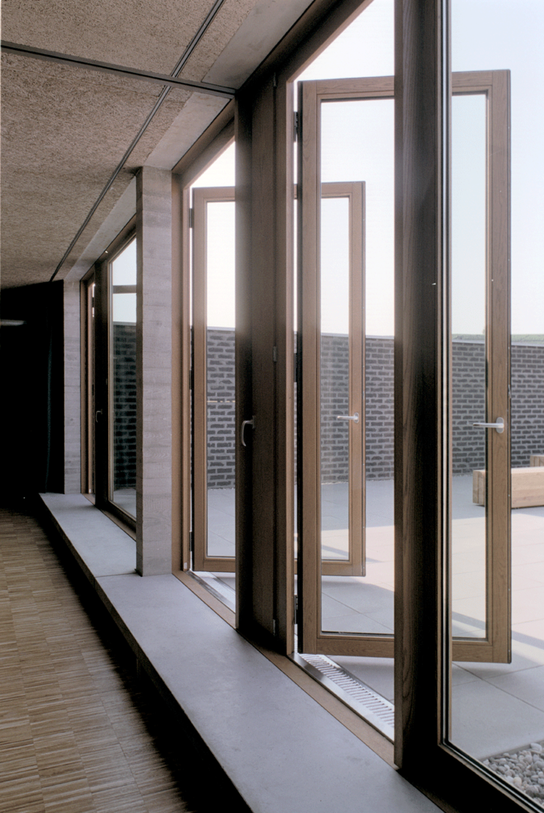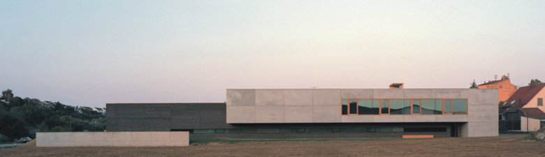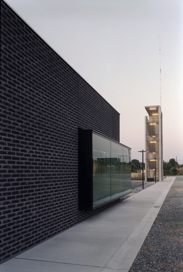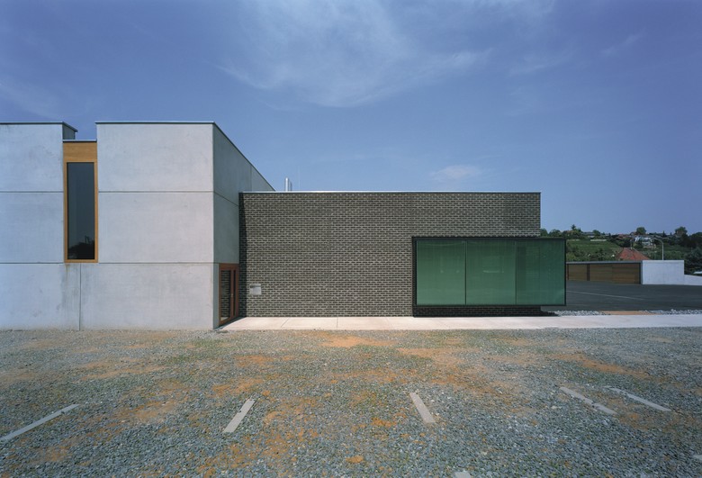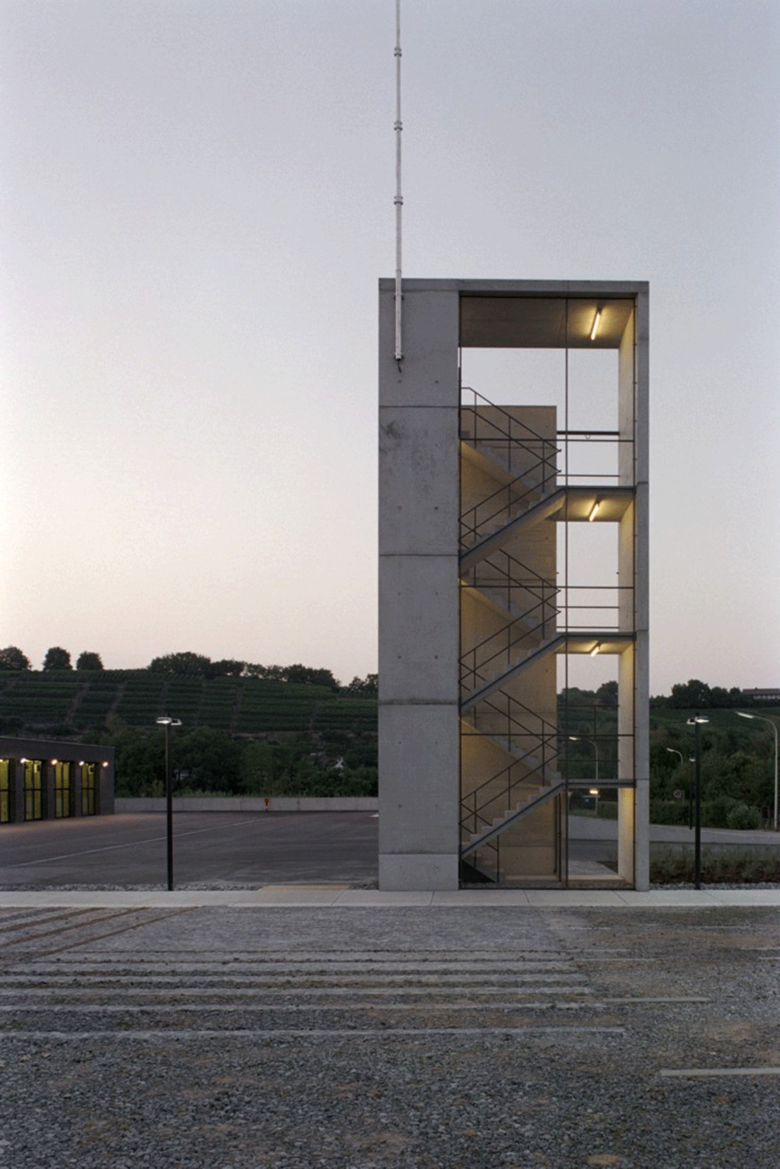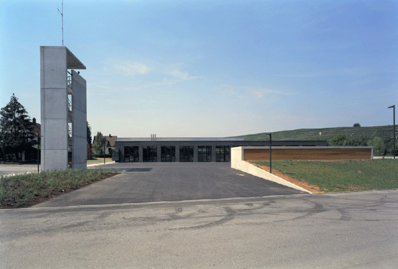 Auf die Heterogenität des baulichen Umfeldes antwortet der Neubau mit prägnanten Formen, eingebunden in ein klar strukturiertes Gesamtensemble. Das Hauptgebäude, die den Hof umschließenden grünen Erdwälle und der weithin sichtbare Übungsturm bilden eine markante, ortsrandprägende Komposition. Das Hauptgebäude setzt sich aus einem einfachen Kubus und einem sich einschneidenden Bügel zusammen. Durch die Verwendung zweier unterschiedlicher Materialien, Ziegel und Beton, werden die beiden Nutzungseinheiten, Feuerwehrtechnische Einrichtungen und Verwaltung, auch von außen ablesbar.