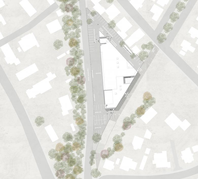 Der Entwurf nimmt die Gegebenheiten des Ortes auf, indem er die Form des Grundstückes auf das Gebäude überträgt. Es entsteht ein 2-geschossiges kompaktes, funktionales Gebäude aus Feuerwehr und DRK, das als Einheit auch der Nachhaltigkeit dient. Durch das eindeutige Zuordnen der Aussenflächen zu den jeweiligen Funktionsbereichen wird ein sicherer und nutzungsorientierter Ablauf angestrebt, welcher sich ins Innere des Gebäude weiterzieht.
