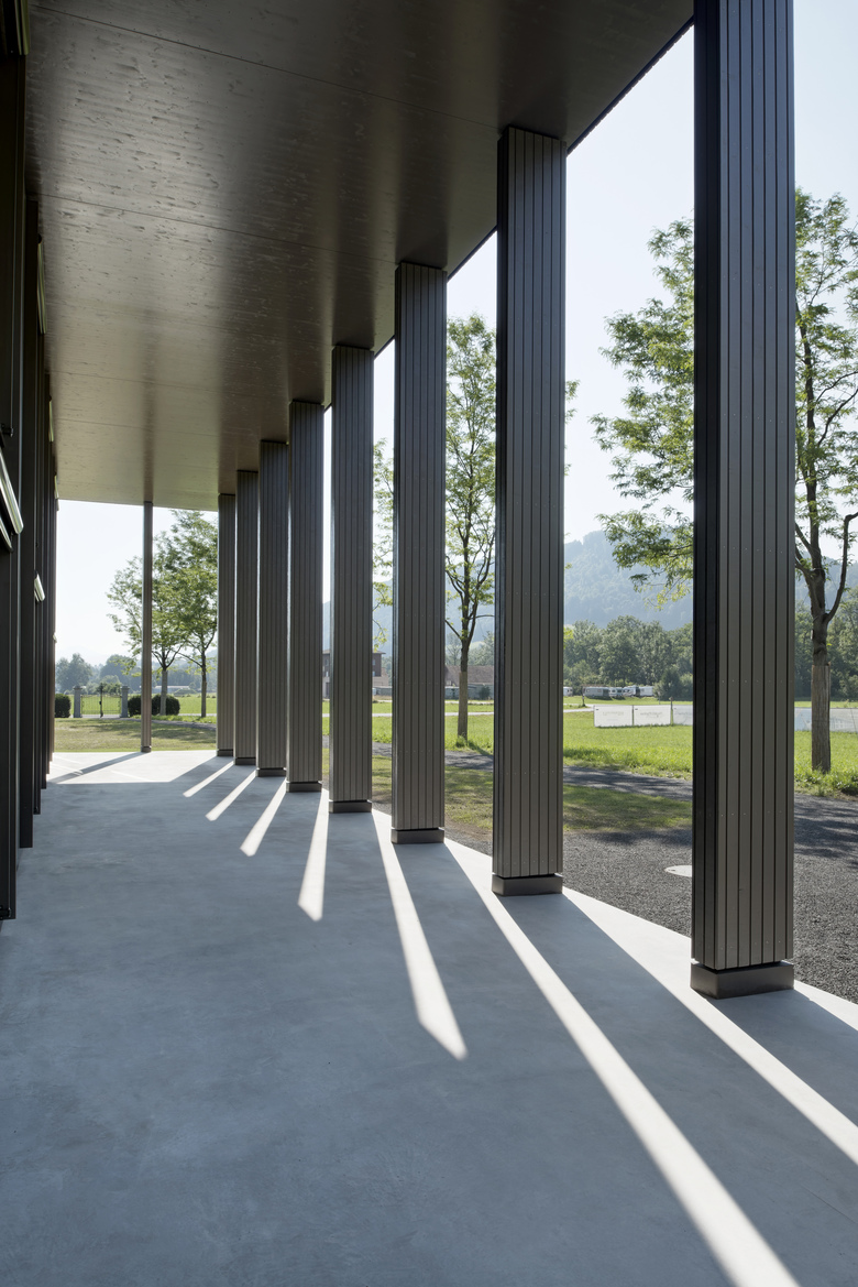 Das Büro, umgeben von einer schönen Gartenanlage, präsentiert sich als grosses, tempelartiges Gartenhaus. Dem direkten Sichtbezug zur Umgebung mit grosszügigen Fensterflächen wurde grosse Aufmerksamkeit geschenkt. Das Gebäude passt sich farblich optimal in die Umgebung ein. Mit der offenen vertikalen Holzschalung, mit einem zurückliegenden orange-farbenem Windpapier, verändert sich der Ausdruck des Gebäudes je nach Betrachtungswinkel und Sonnenstand stark.