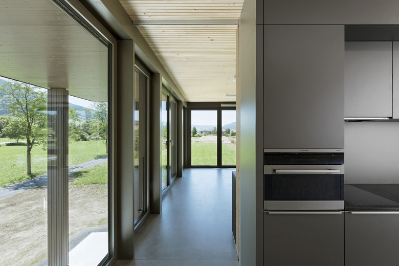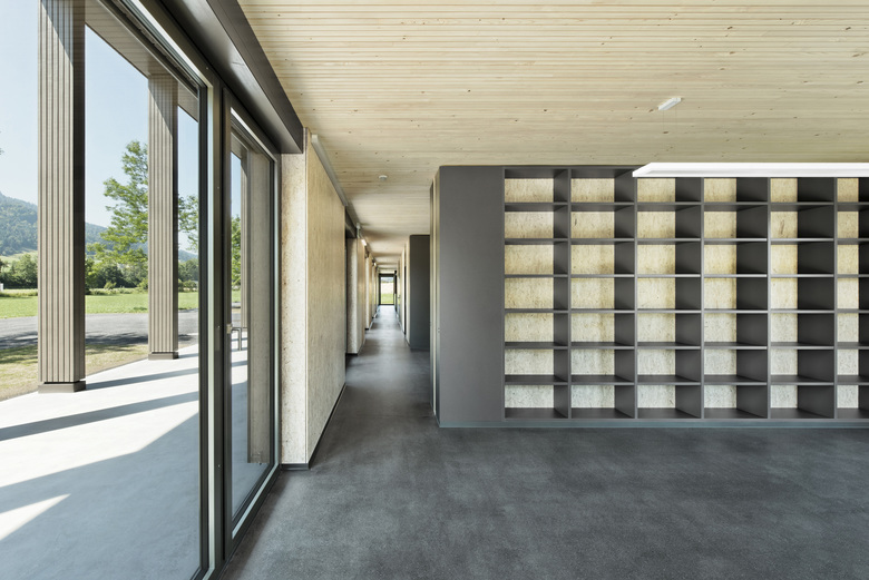 Der schonende Umgang mit natürlichen Grundmaterialen ist der Bauherrschaft vor allem als Gartenbauer sehr wichtig. Darum kam für sie nur ein ökologischer und energieeffizienter Holzbau in Frage. Die Verwendung der Materialien im Innern steht in direktem Bezug zur Unternehmung. Die Brettstapeldecken mit einem Akustikprofil und die Wände, mit OSB-Platten beplankt, wurden gezielt roh belassen und sind lediglich lasiert. Somit bleibt die Struktur des Materials Holz bestehen und kann durch die Mitarbeiter und die Gäste erlebt werden. Das Gebäude wurde als Low-Tech Bau ohne Lüftung konzipiert. Durch die grosszügige Dachauskragung südseitig und die markanten Holzlamellen, welche um das Gebäude angeordnet sind, wird viel Schatten gespendet und die Anforderungen und Bedürfnisse der Bauherrschaft konnten erfüllt werden.