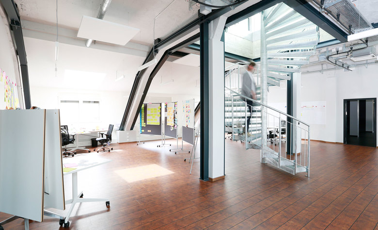 Bei dem Haus an der Mainzer Landstraße 193 in Frankfurt hatten wir die Gebäudesubstanz schon 2016 grundlegend saniert und die unteren Etagen für ein Möbelgeschäft hergerichtet. Nun durften wir auch die beiden obersten Geschosse in Angriff nehmen und den Ausbau der Flächen für eine Agentur planen. Das Besondere hier ist die offenliegende Tragstruktur des Mansardendachs im Dachgeschoss und die neue Dachterrasse mit einer tollen Aussicht über die Mainmetropole hinzugefügt - damit Blick und Geist in kreativen Pausen in die Ferne schweifen können.